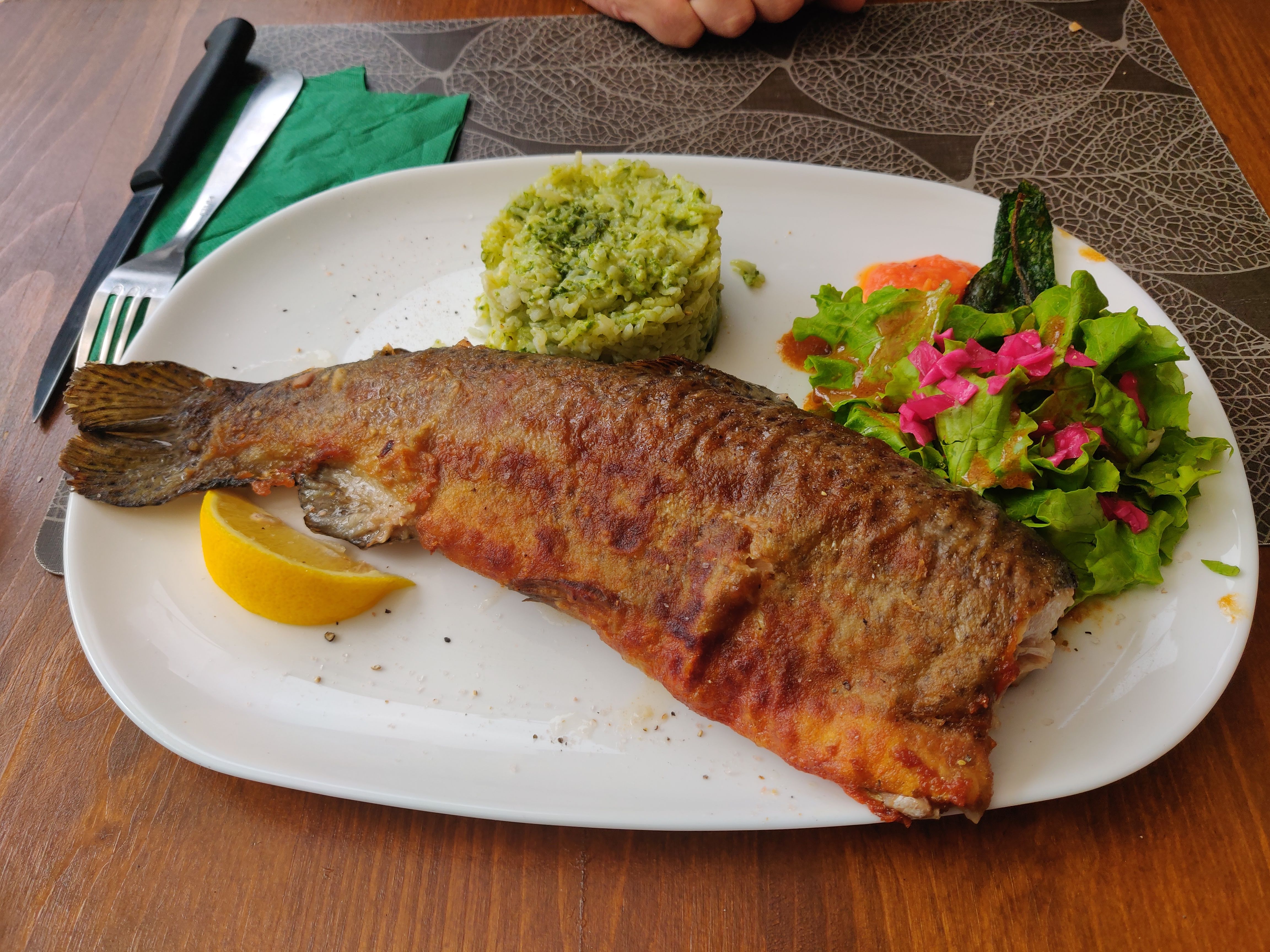 Excellente nourriture, la truite était remarquable, les accompagnements de risotto aux champignons et d'aubergines sur une compote de tomates ont rendu cette assiette remarquable. Le prix est très bas compte tenu de la qualité de la nourriture et du bon service.