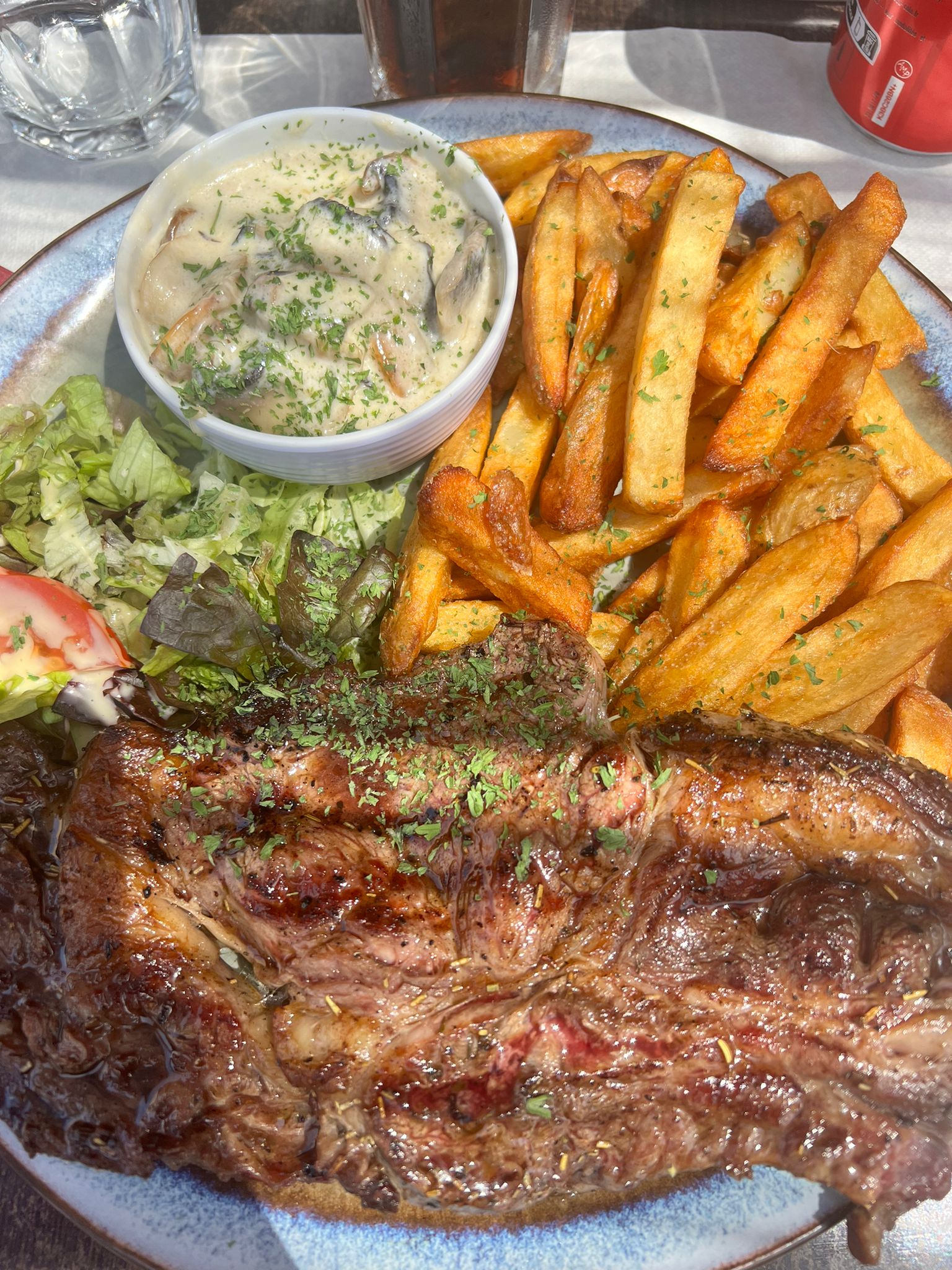 Bon accueil et service . Restaurant agréable pour se restaurer lors d’une étape . Belle Entrecôte, au niveau du gout moyen, cuite avec un peu trop d’huile à mon goût. Idem pour les légumes . Cannellonis moyens aussi