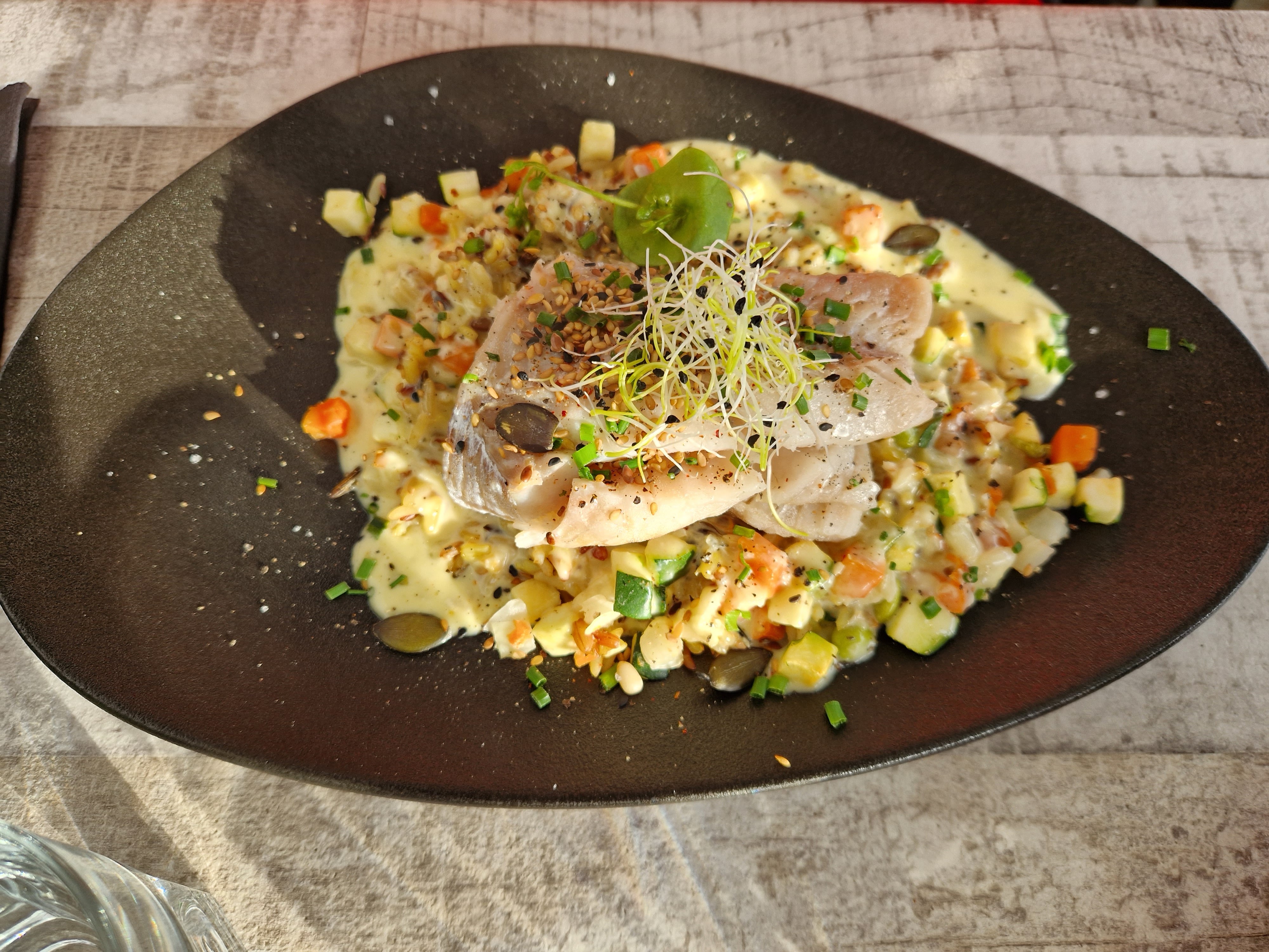 Nous étions venus pour des galettes mais nous nous sommes laissé tenter par les poissons à la carte et nous n'avons pas été déçus ! Brochette de St Jacques parfaitement toastée et le lieu en cuisson lente était fondant. Même les petits légumes qui les accompagnent étaient délicieux . Serveurs tous très accueillants et souriants. On recommande vivement !