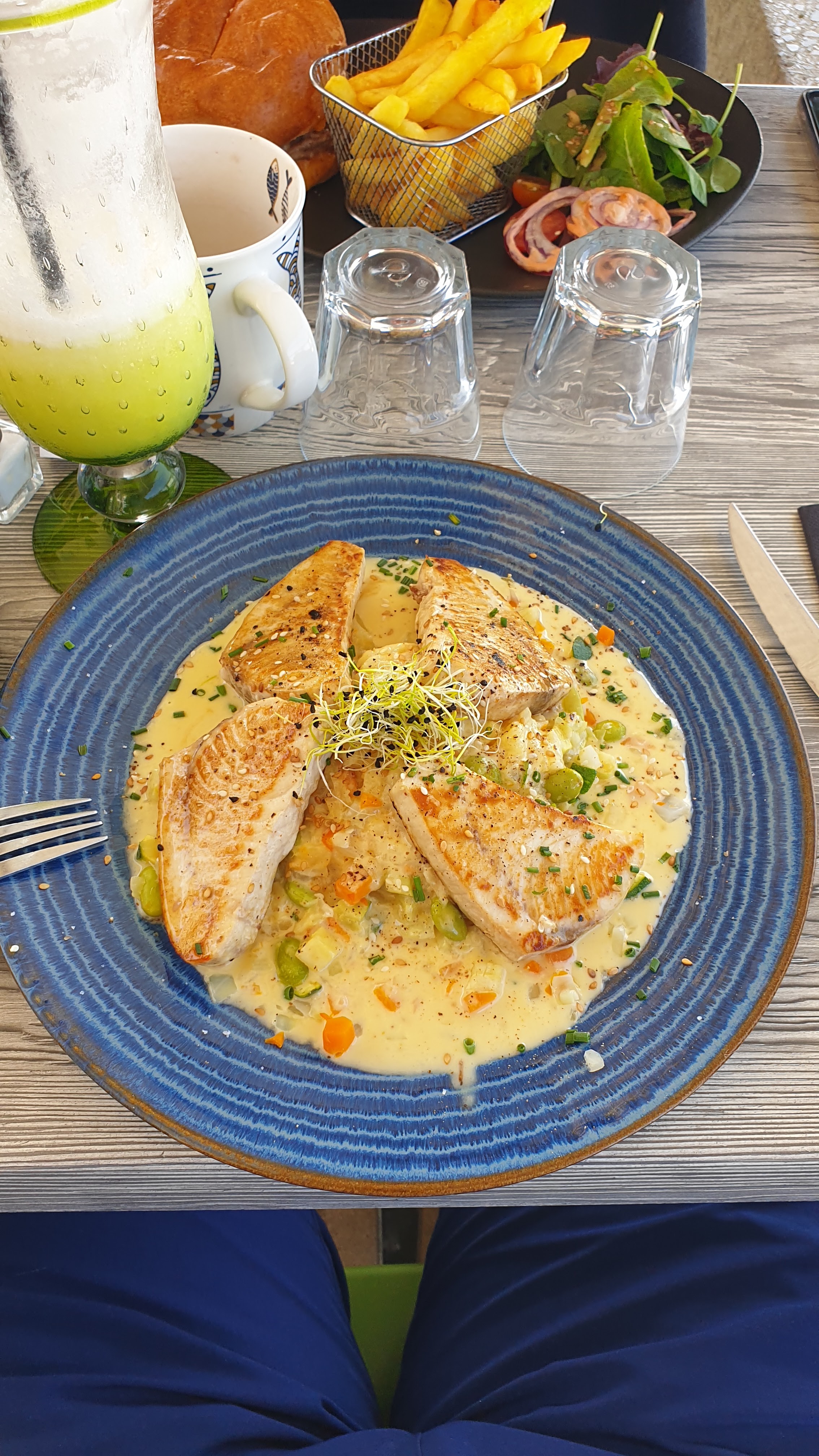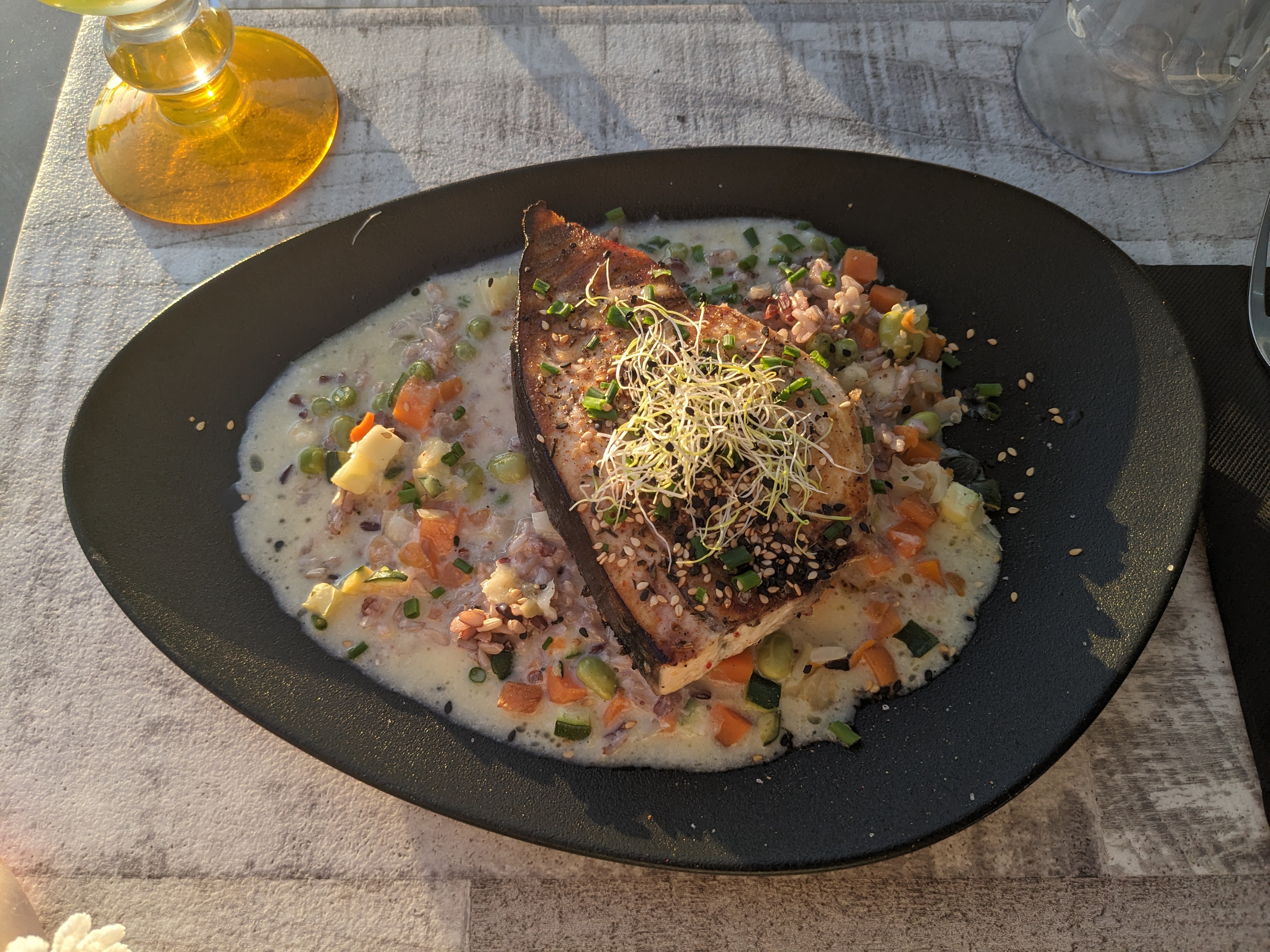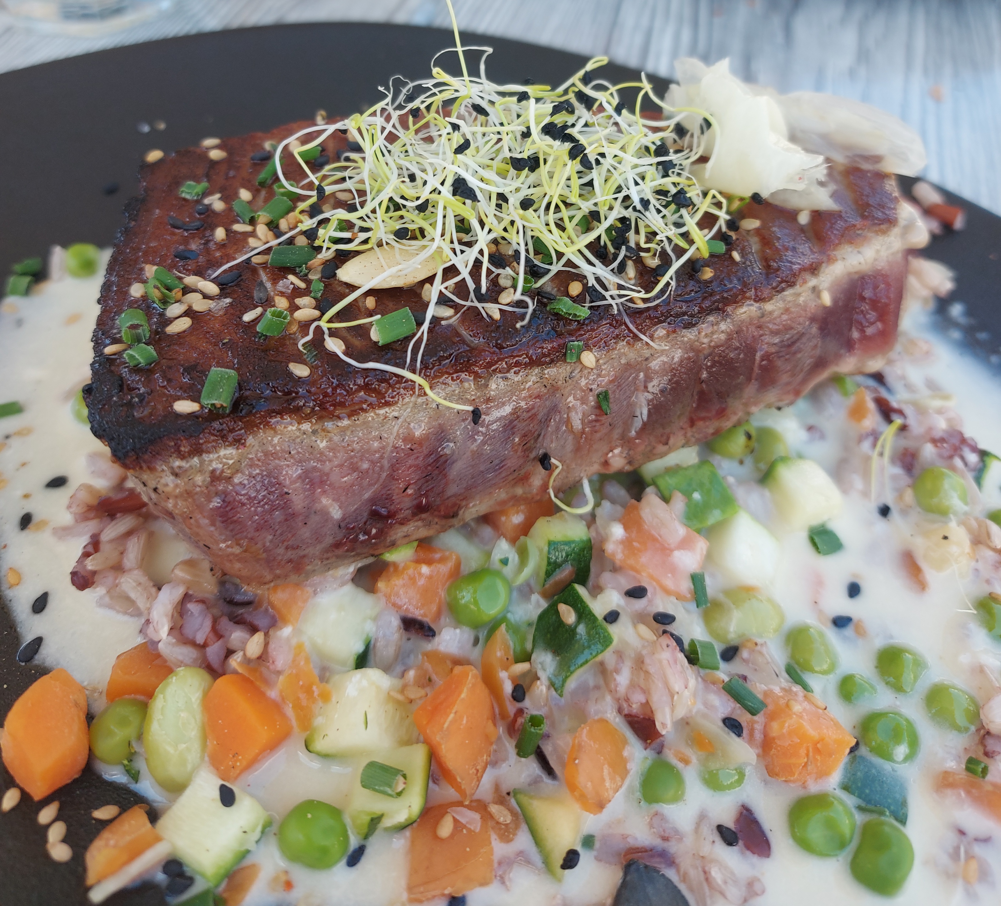Super, face à la mer, un steak de thon rouge au top avec une garniture autre que des frites, petits légumes de saison, tout est génial.