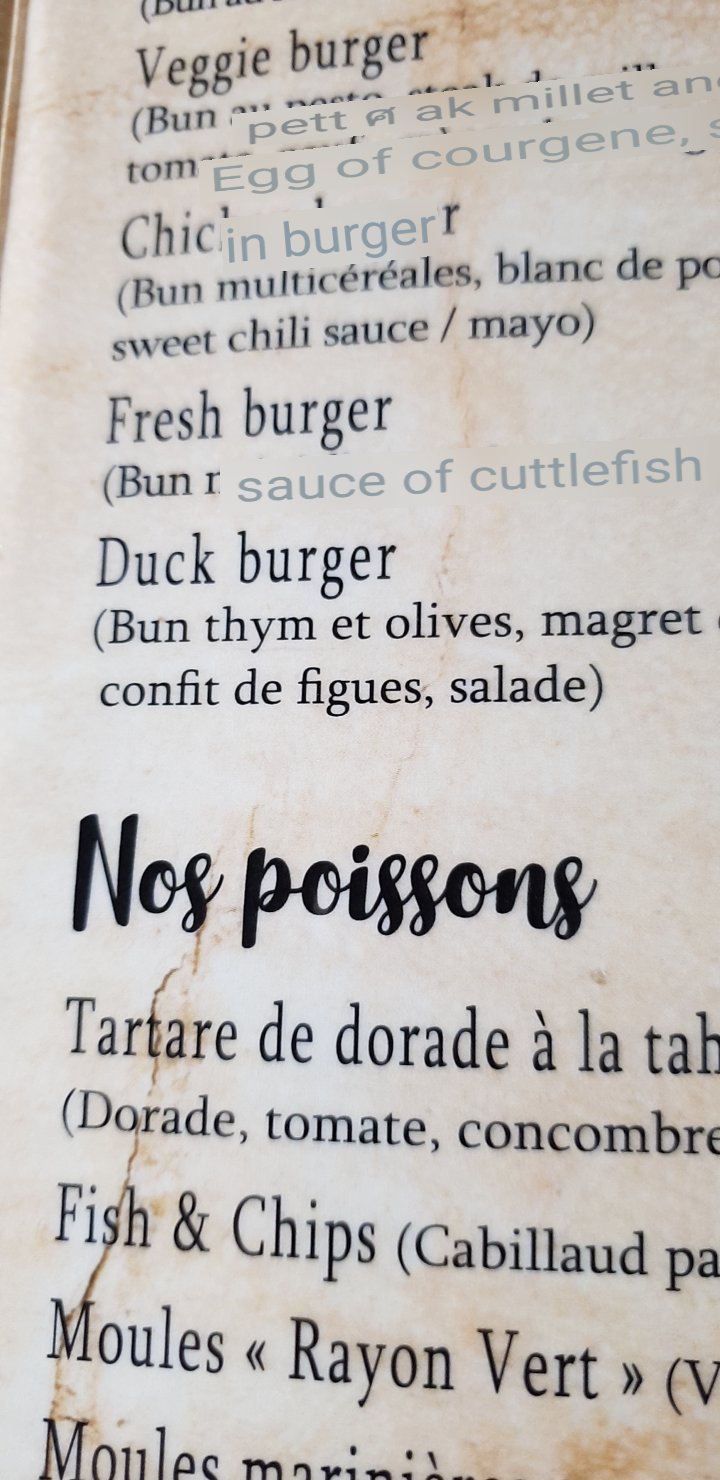 La cuisine est excellente j'avais pris le burger a la viande de canard un vrai délice servi avec des frites maison délicieuses et de la bonne salade. Je recommande et au niveau tarif c'est dans la norme