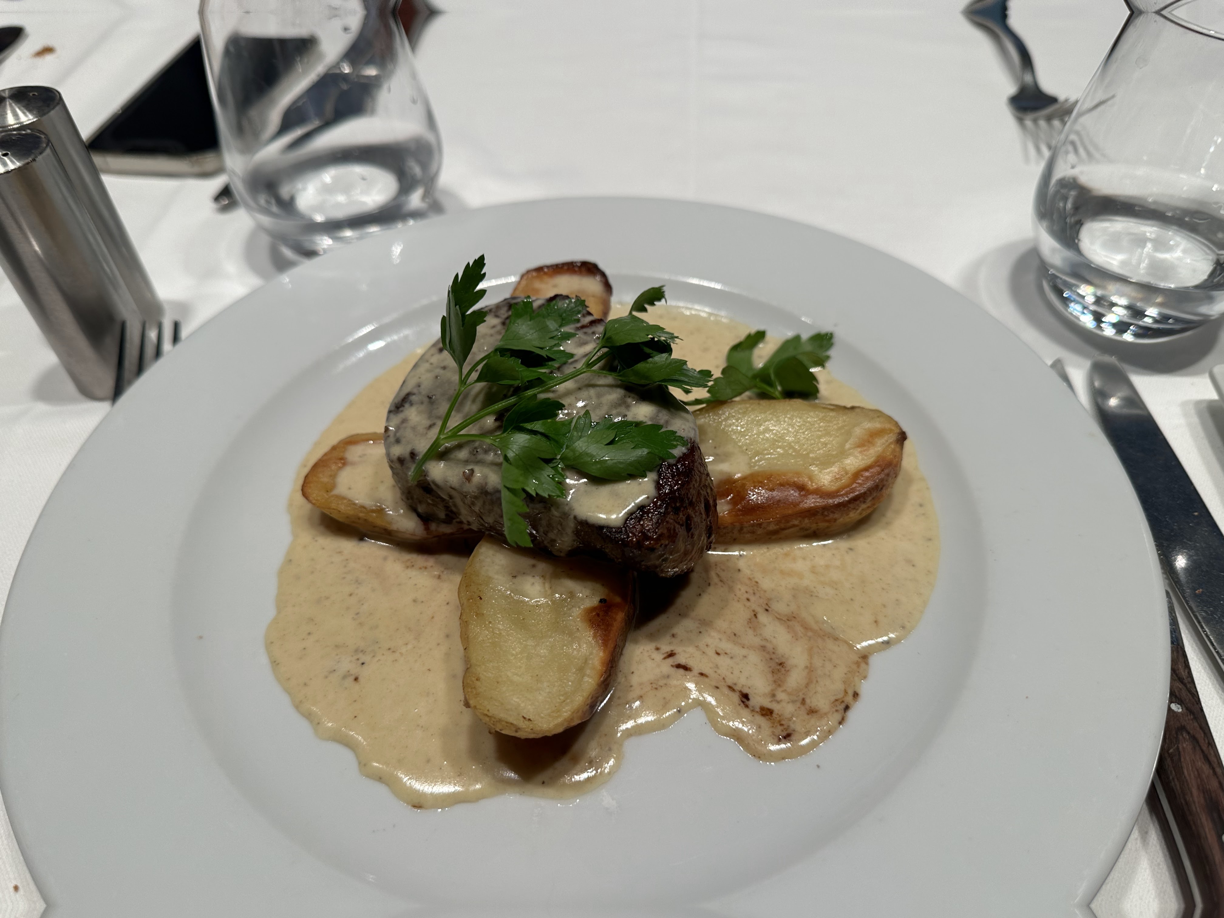 Il y avait les Rognions de Veau et ils étaient excellents. Au départ, j'ai opté pour le Filet aux Poivre mais les Rognions ne sont pas aussi souvent au menu. Le reste est dans une rue calme. Leur spécialité, le Soufflé, a l'air impressionnante
