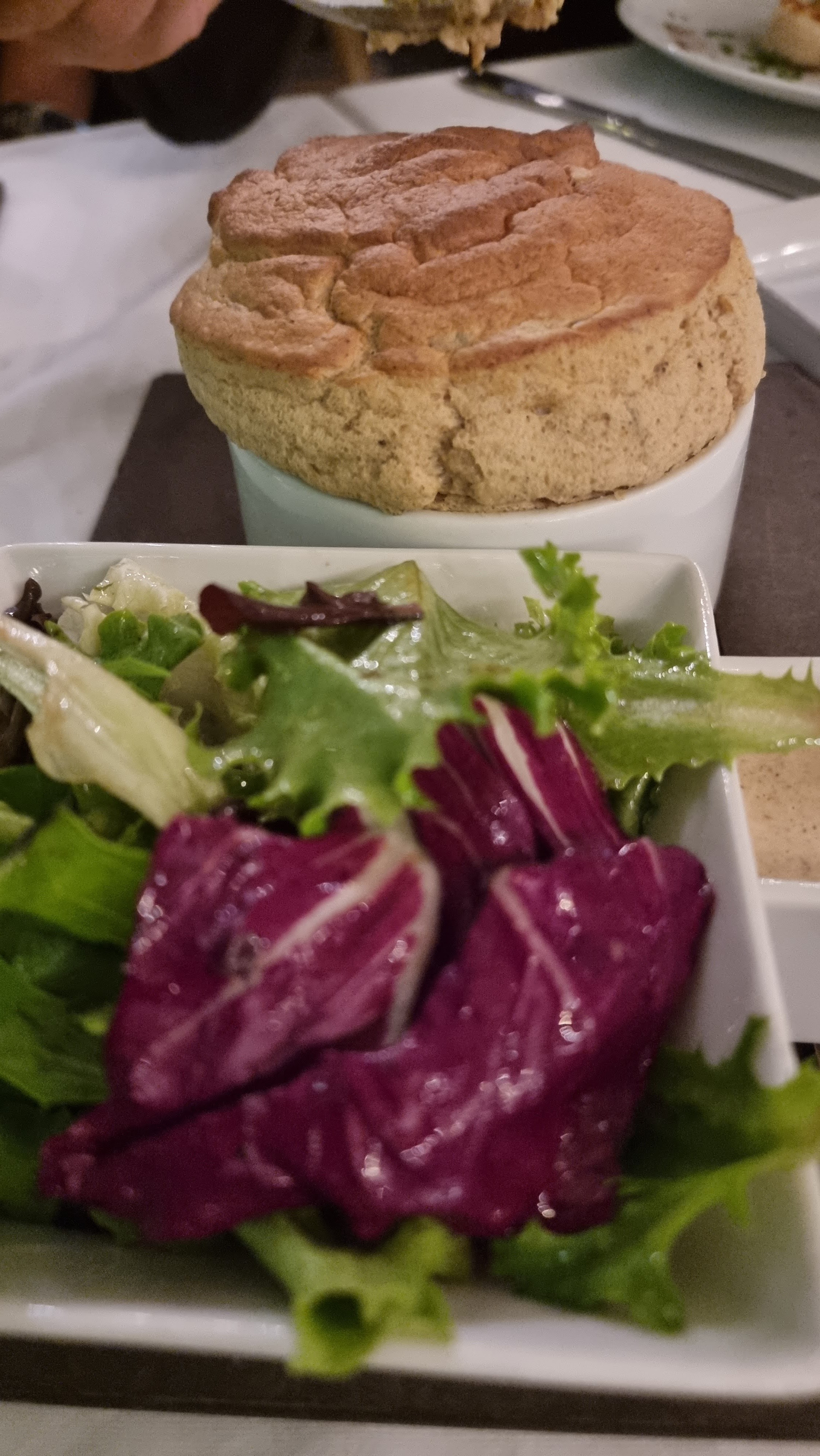 Le soufflé était excellent, particulièrement savoureux, et c'est pour cela que nous sommes venus. Cependant, je dois noter que nous avons également commandé deux salades, et dans les deux cas, les feuilles étaient si mal lavées que le sable craquait sous nos dents. Je suis surpris de vivre cela dans un restaurant de ce niveau. Sinon le service était très attentionné et l'ambiance agréable.