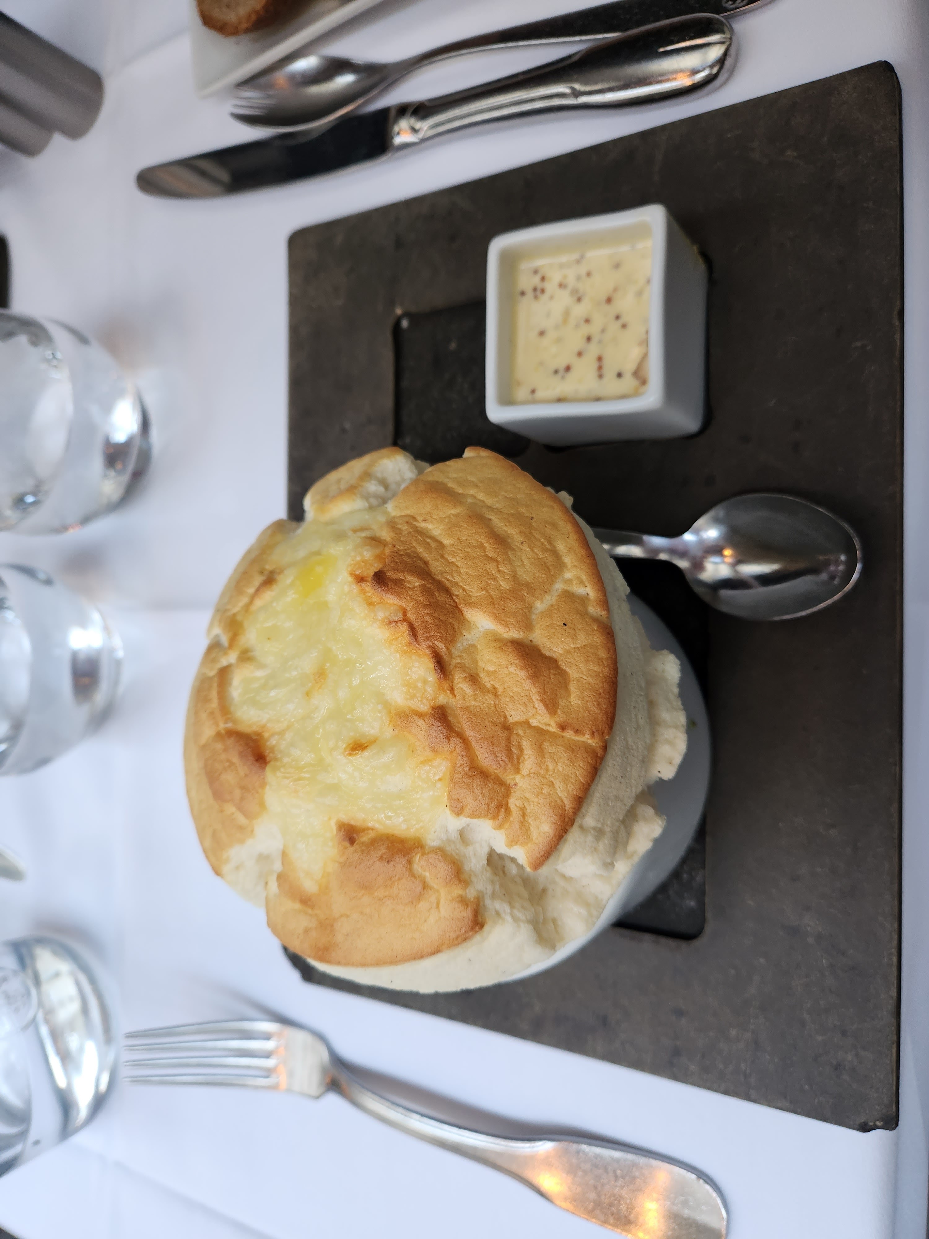 Quel délicieux déjeuner j'ai eu sur la terrasse ! Un fantastique soufflé au fromage avec une sauce à la moutarde accompagné d'une coupe de champagne. Service accueillant et convivial. Je recommande!