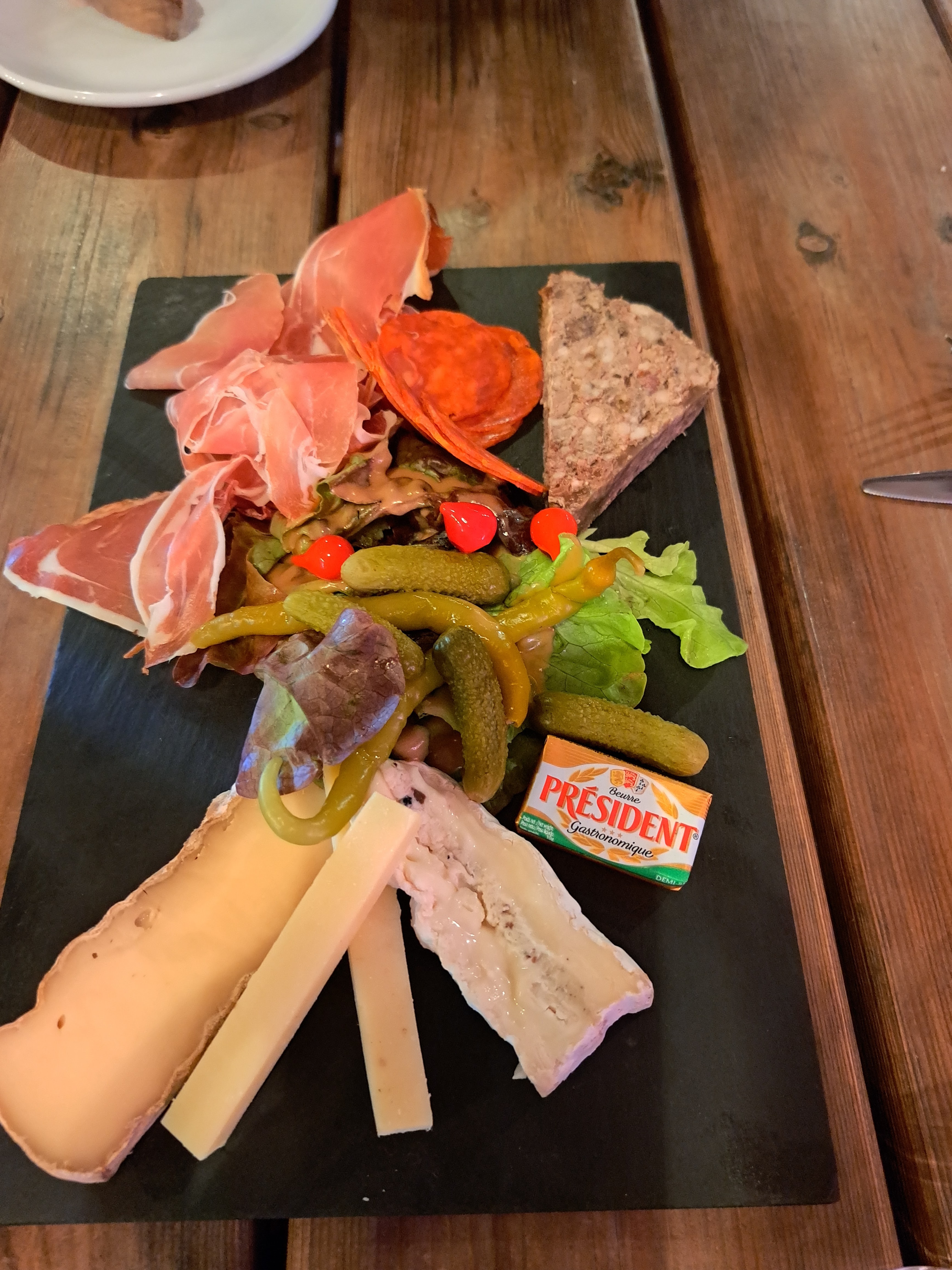 Repas en famille. Planche à partager avec un foie gras très bien. Ensuite entrecôte avec frites. La cuisson de la viande était parfaite. Repas en terrasse super