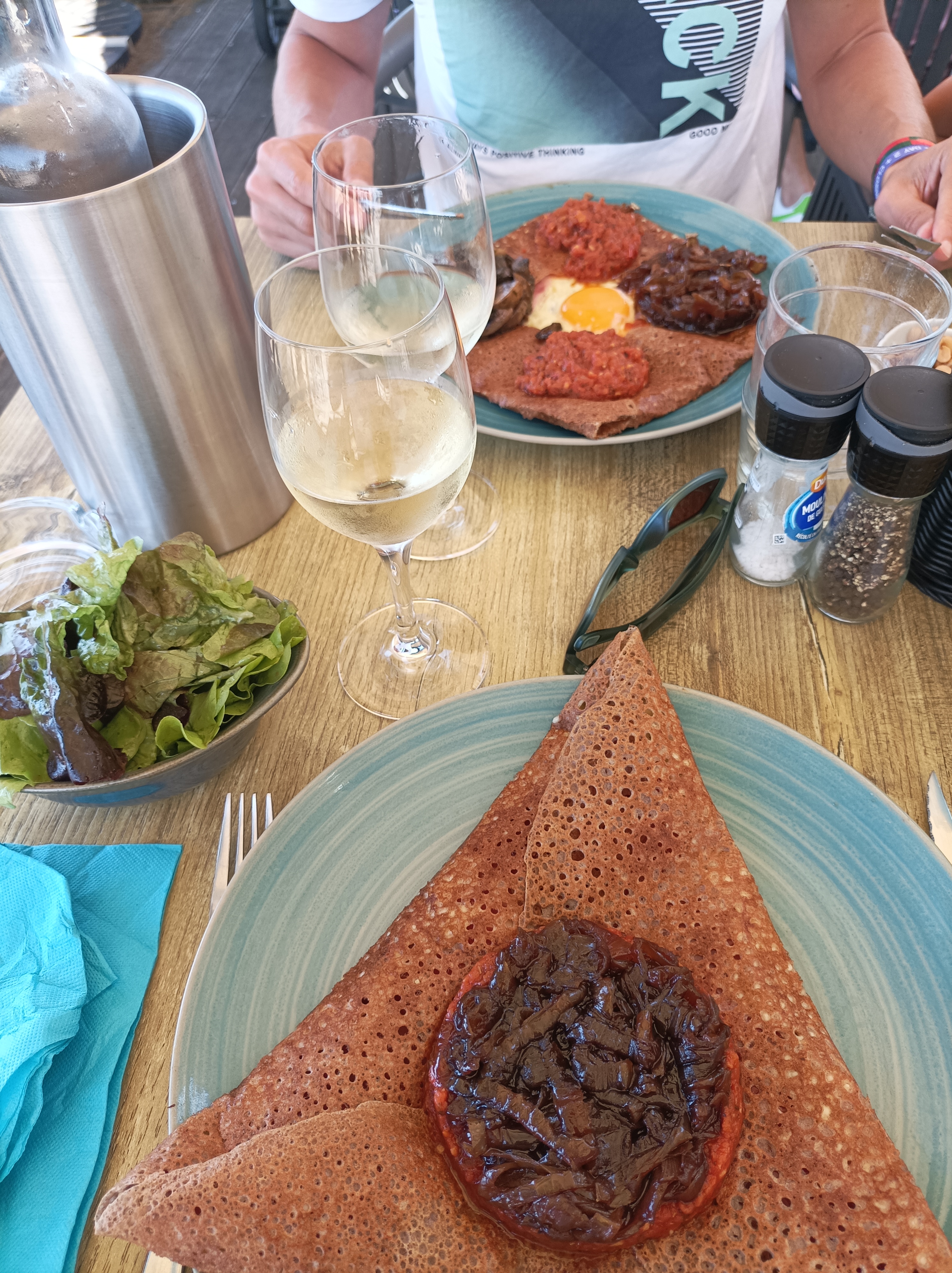 En terrasse en face de la mer. Les crêpes très copieuses, je recommande, pas assez de places pour le dessert. La serveuse très gentille