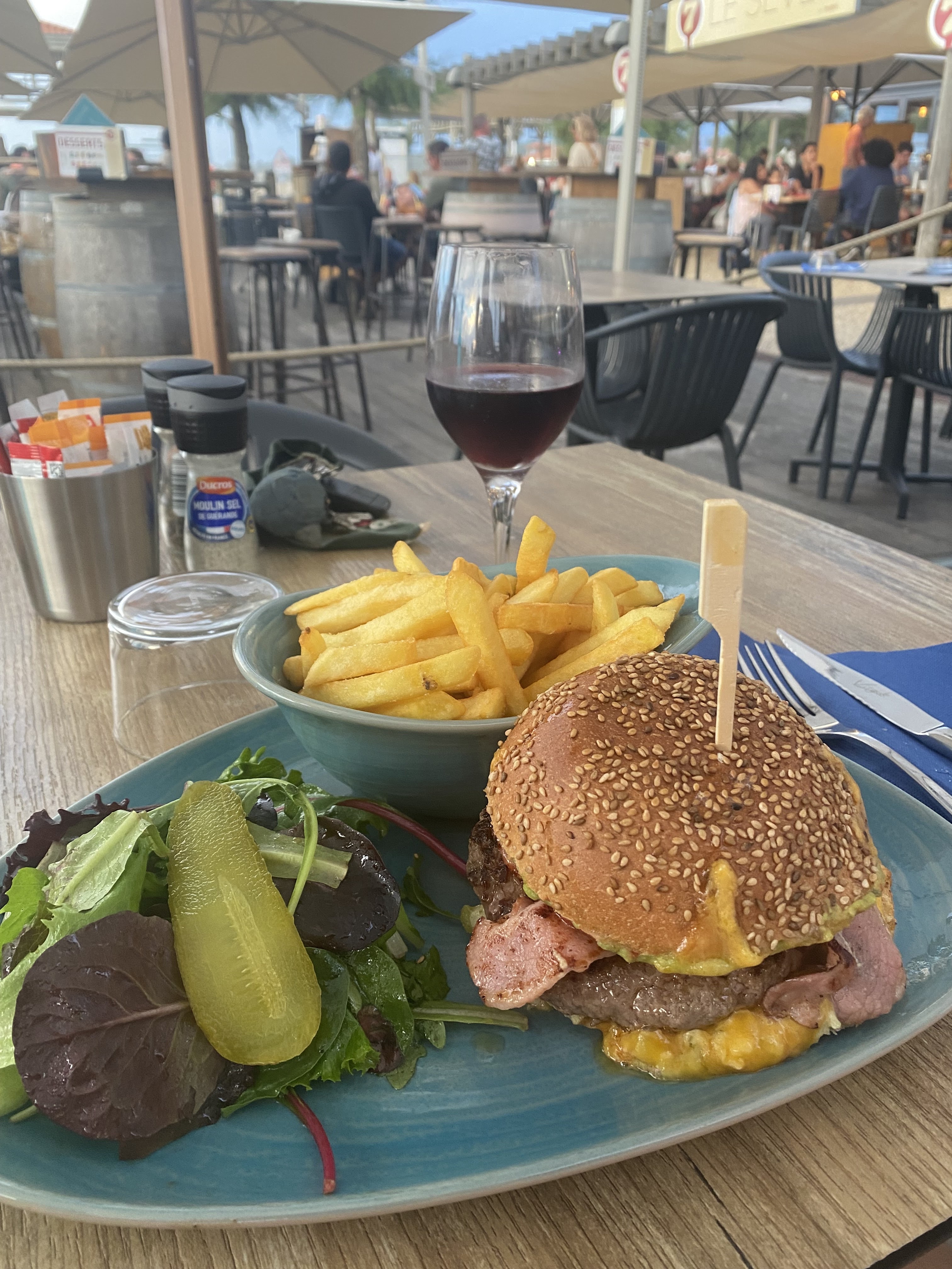 Pas de grande gastronomie mais simple est très bon. Les hamburgers frites étaient parfaits la cuisson respectée Les filles au service sont souriantes et à l' écoute. Le petit plus est une belle vue sur l'océan et les surfers Je recommande