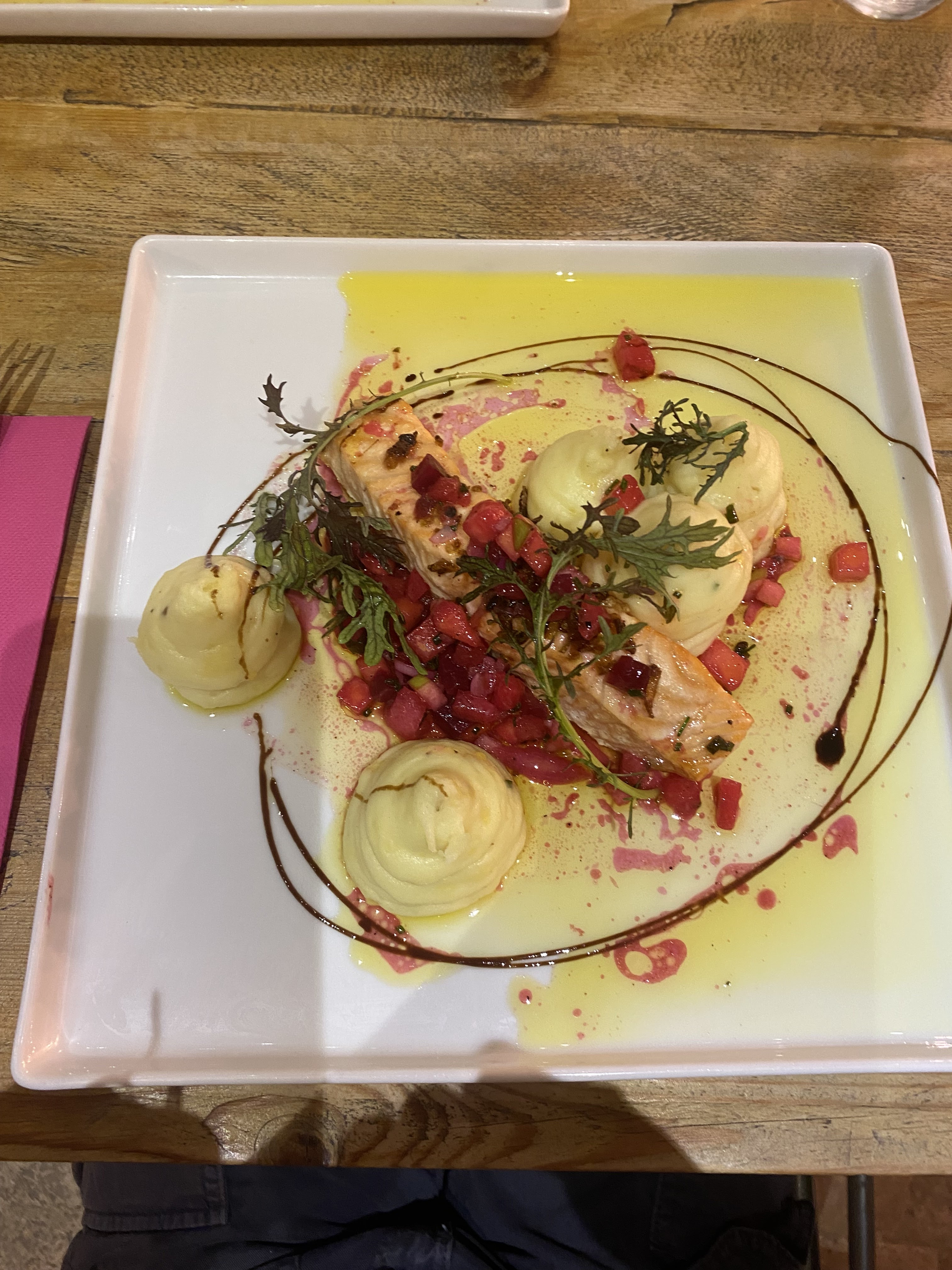 Petite visite pendant mon séjours à St Martin de ré Très bel endroit avec une décoration atypique !!! J'ai eu le plaisir de manger un saumon rôti Et une mousse au chocolat. Mon plat était une tuerie tout simplement Serveuse très agréable !!! Bravo à l équipe, et continuez à égayer nos papilles.