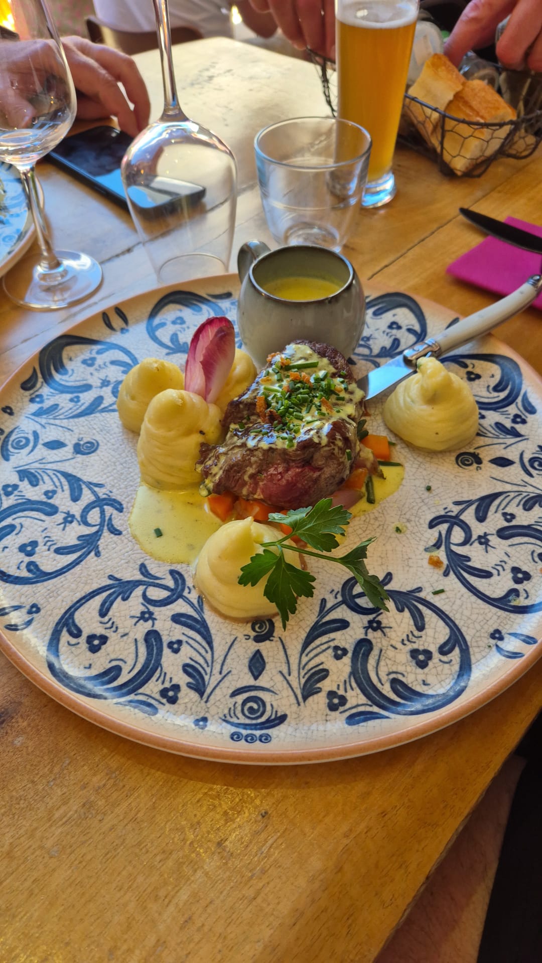 Super . PARFAIT . Rien a voir avec les restau a touristes aux alentours . J ai mangé un tournedos Rosini . Un delice . Son foie gras . Sa sauce . Et j ai eté gâté pour le dessert . Merci au chef , et au service . J y retourne en juin Philippe B