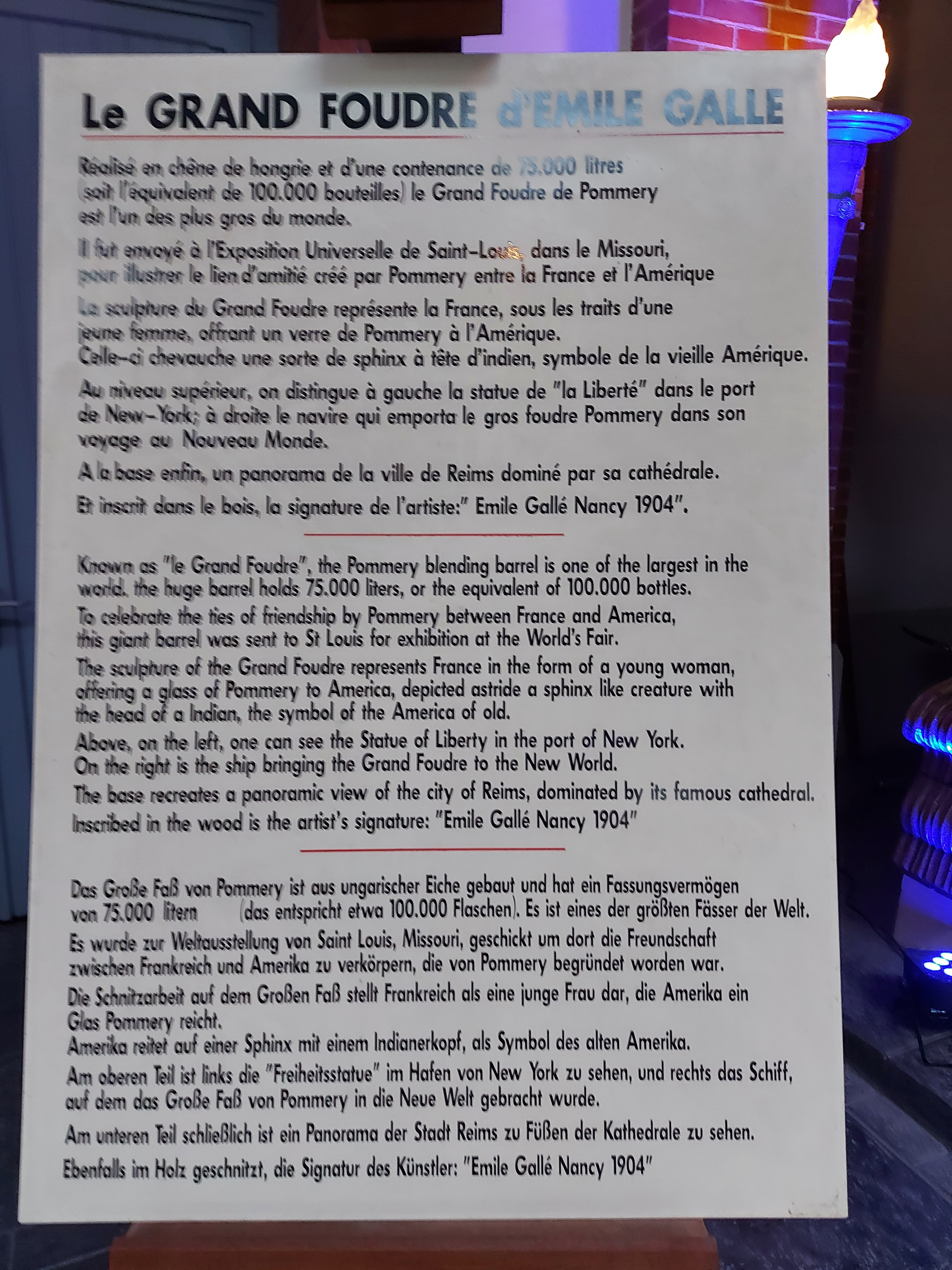 Fantastiquement sympa de savoir comment utiliser les anciennes caves de champagne avec les installations artistiques magiques tout en découvrant l'histoire de la maison et la façon dont la fabrication est effectuée. Vraiment cool. L'audioguide a très bien fonctionné. Vous avez téléchargé une application, puis utilisé le Wi-Fi gratuit.