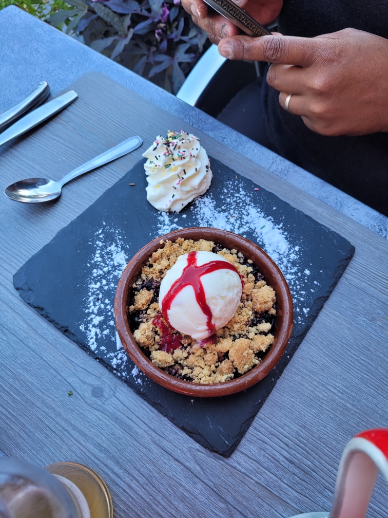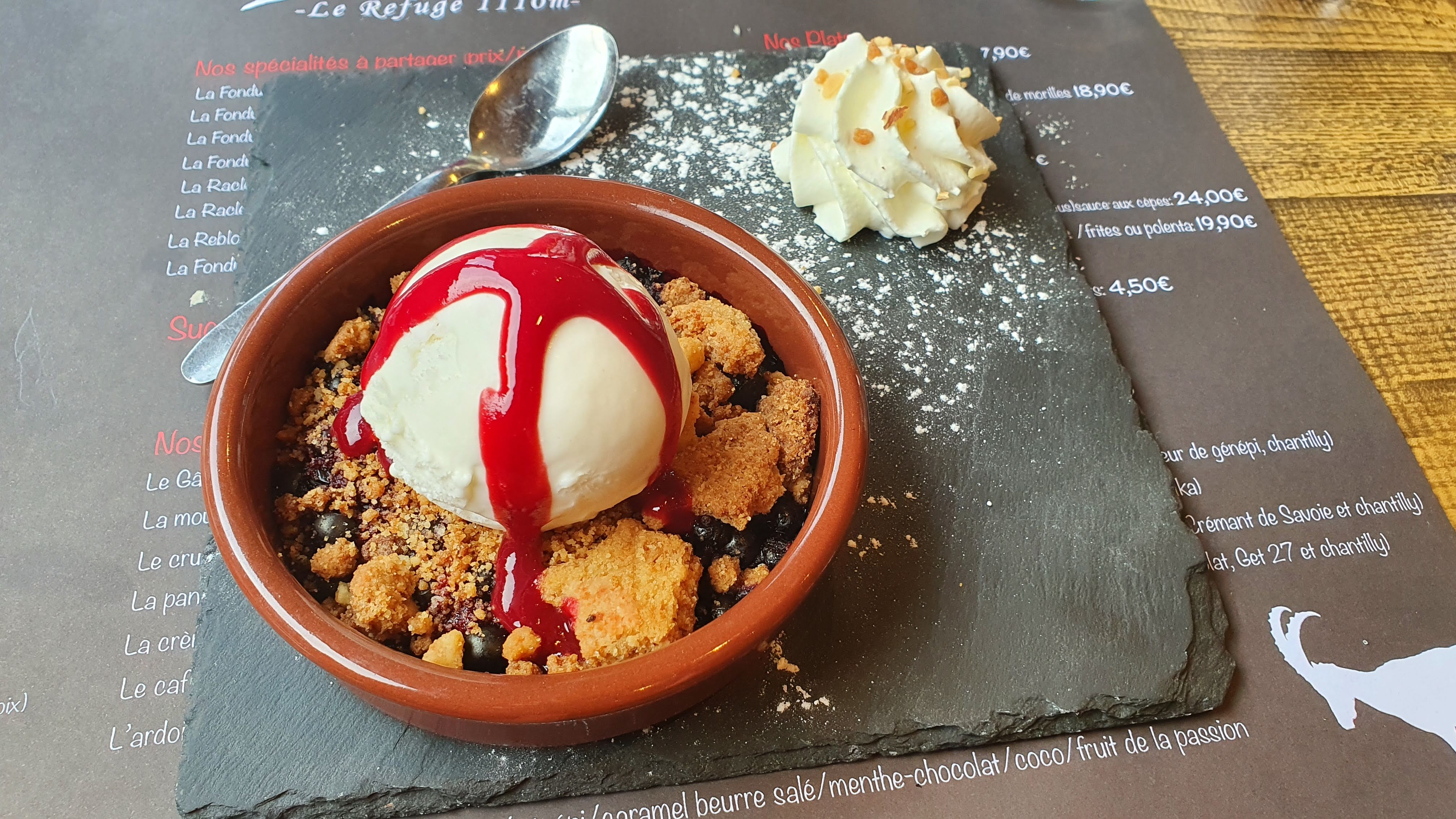 Un vrai restaurant de fondue et raclette comme on aime à la montagne ! Et crumble myrtille pour finir, miam! Ambiance chalet Je recommande !