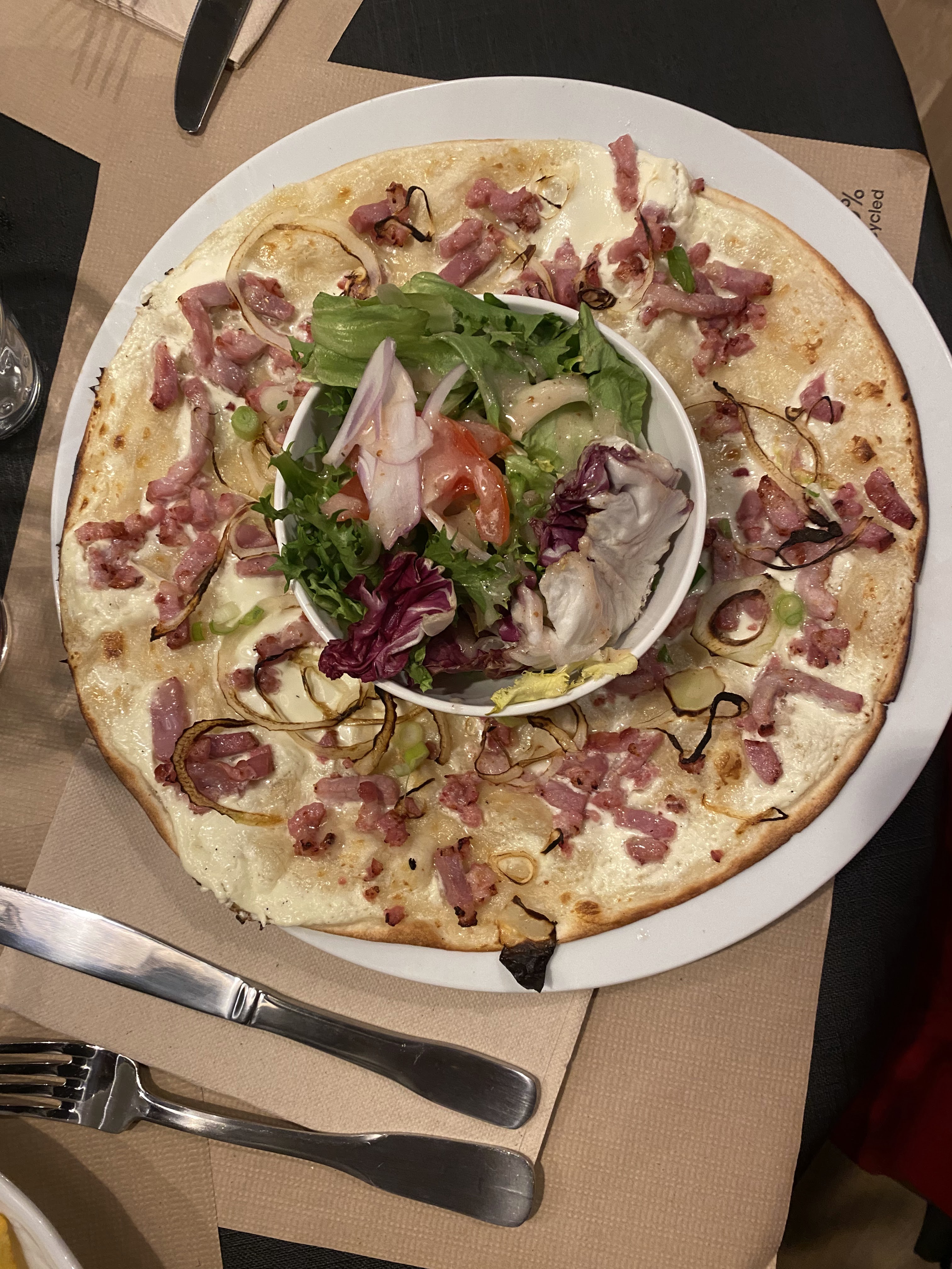 Flammenkuc très bonne, et fondue fromage champignons délicieuse