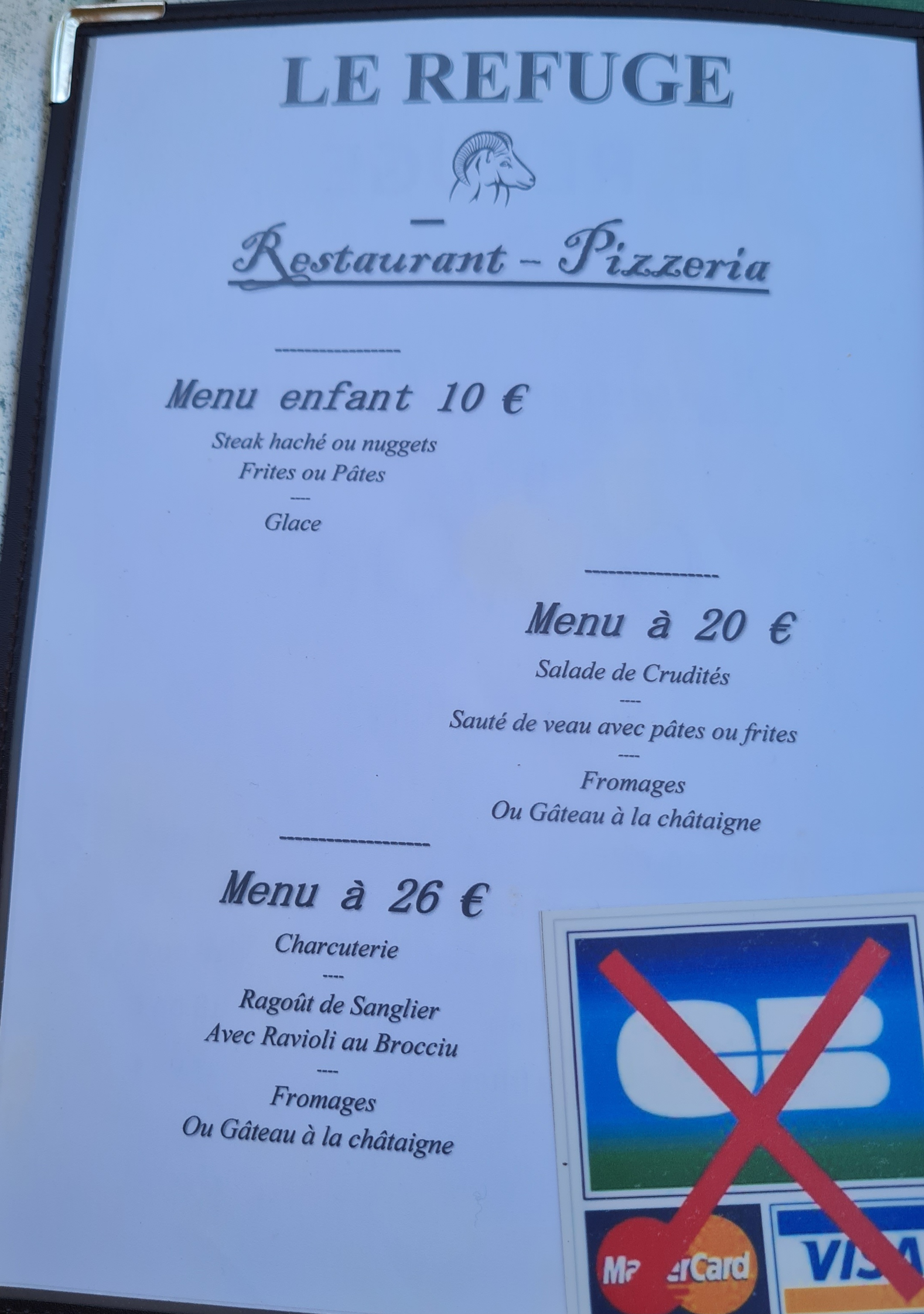 Petit resto comme on les aimes, avec surtout un menu, ce qui est pas courant en Corse, pas d’arnaques et en plus c’est très bon , patronne au petit soins, le seul restos où je me suis senti bien, seul le prix des desserts pas abordable par rapport au choix du menu, dommage sur le col , pas possible d’y aller tout les jours.