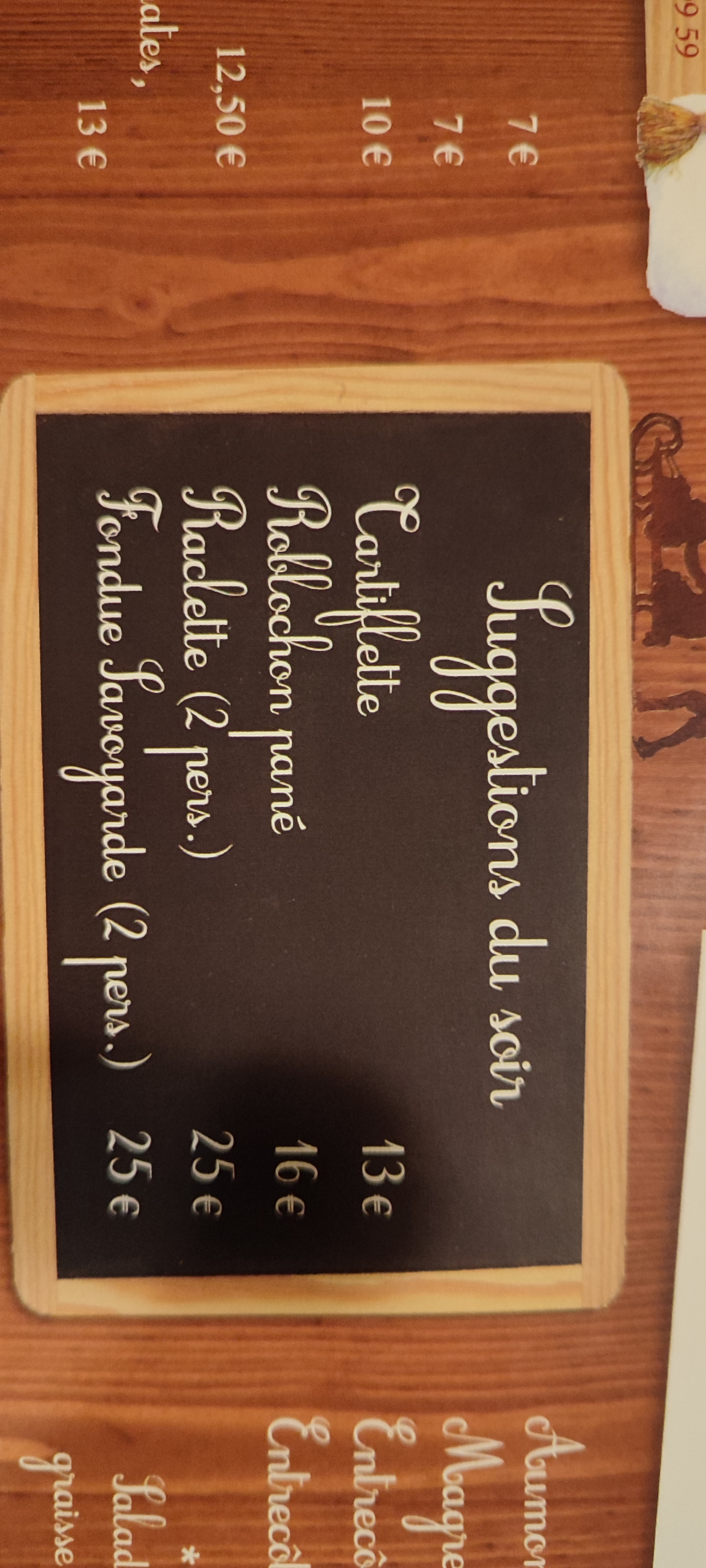 Personnel accueillant ; c’est le seul point positif de cet établissement. Menu de soir 22 euros avec une soupe « knorr » ou « maggi »en sachet; cela ne revient pas plus cher de peler quelques légumes pour en faire un bon mouliné MAISON. La raclette n’était pas mauvaise mais j’ai trouvé mieux en plein bordeaux ( c’est dommage pour un restaurant de montagne). De plus les patates avaient déjà quelques heures de cuisson. Pour finir il est décevant d’afficher au comptoir de très belles estampes de grands crus et ne proposer qu’à la carte un seul vin rouge absolument immonde. Bonne chance pour la suite