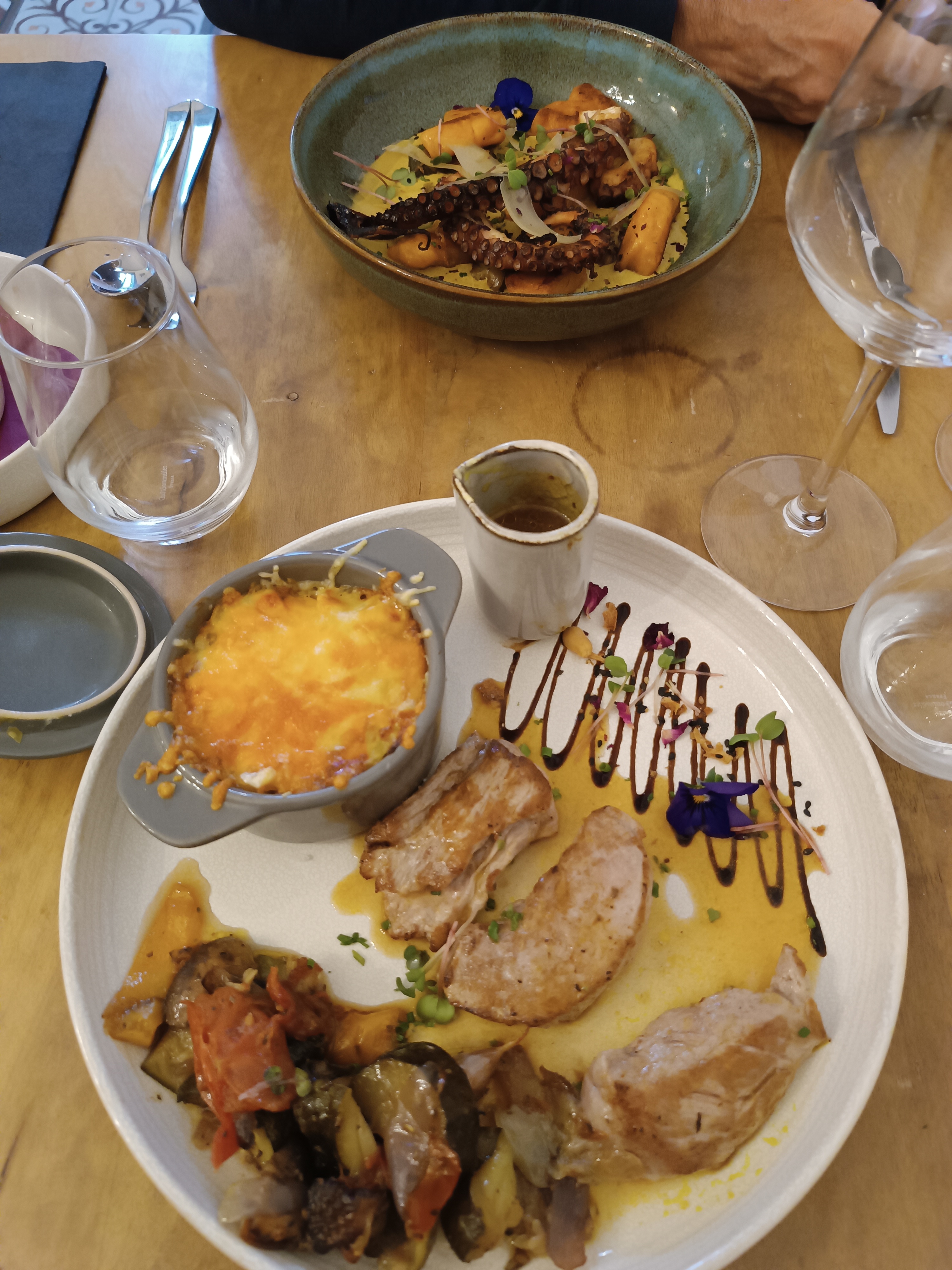 L'église viens de sonner les 9 coups de cloches. L'endroit est super. Deux terrasses. La serveuse souriante, agréable, au petit soin. Je me suis régalée avec le poulpe. Préparation originale. Le vin conseillé excellent. On sort des sentiers battus. Un très bon moment.