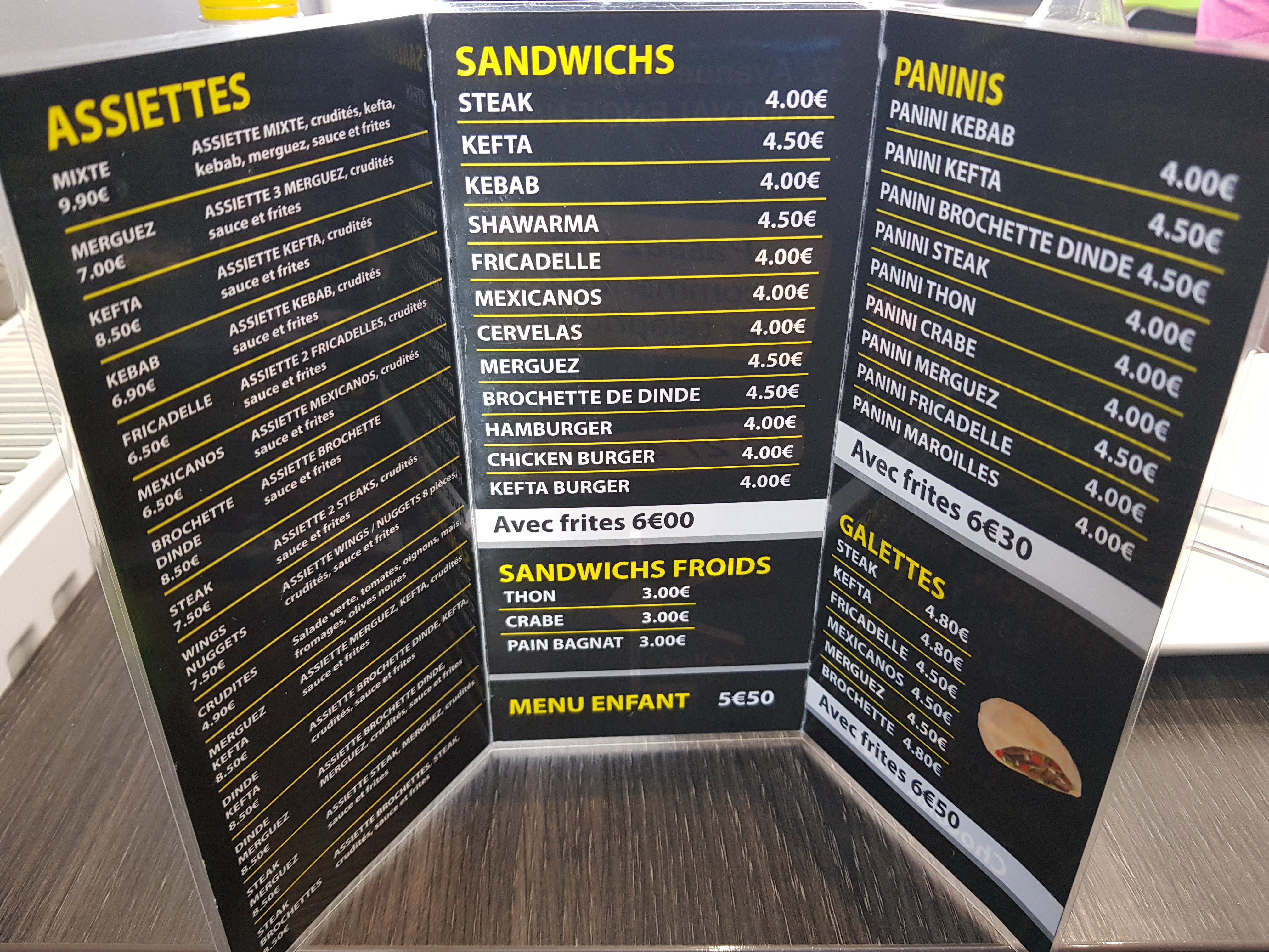 Très bon resto'''tres bonne nourriture 'tres bien servis'''tres très propre'ns n'allons nulle part ailleurs pour manger des super bonnes frites'et le kekab dinde/poulet avec du maroilles. C un delice'''et très bien accueilli par Moustapha et abbdel''''il faut leur donner bcp detoiles