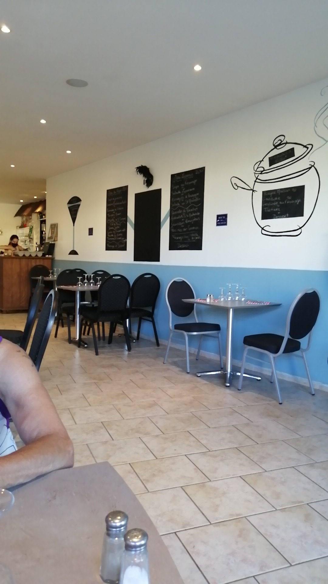 Serveuse très agréable fois gras très bon mais pièce de bœuf bof et accompagnement pas extra et en cuisine pas de masque que quand il vont en salle gros chien un client dans la salle