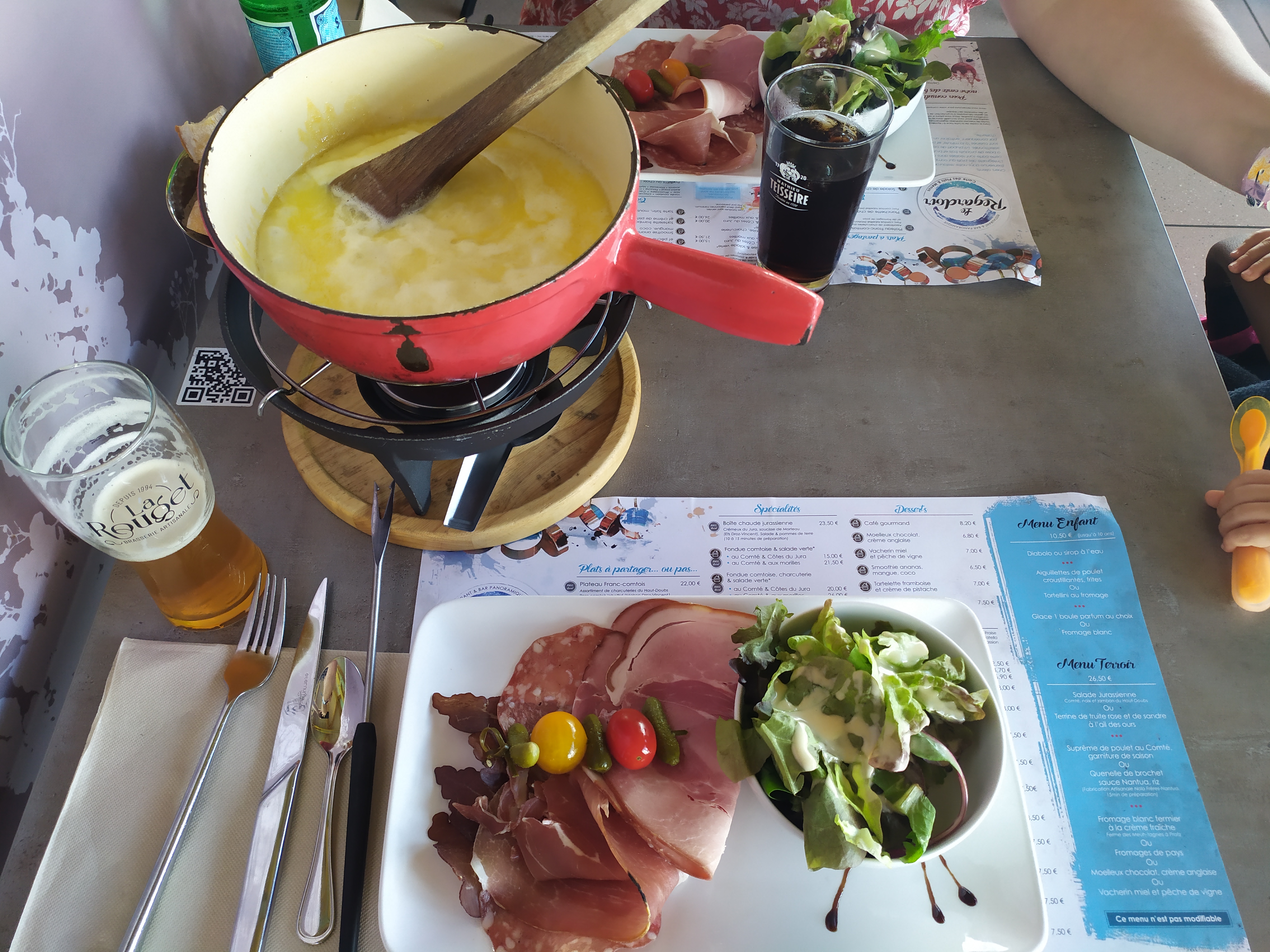 Repas de qualité avec des produits locaux. Nous y sommes venu 2 fois. La fondue au comté et aux morilles est un délice. De plus les morilles ne sont pas en tout petits morceaux comme cela peut parfois se voir ailleurs. Elle vaut le détour à elle seule ! En ce qui concerne le service, la première fois, nous n'avons jamais eu le même serveur mais cela n'a absolument pas perturbé la qualité du service qui fut rapide. La seconde fois nous avons été servis par la même personne, ce qui est très agréable d'autant que celle ci était très à l'écoute, agréable et souriante. (certain plats sont fait à la minute ce qui peut engendrer un petit temps d'attente mais cela est précisé sur la carte) Il est vrai que c'est un budget, mais ça vaut vraiment le détour d'autant que la vue sur le lac est magnifique.