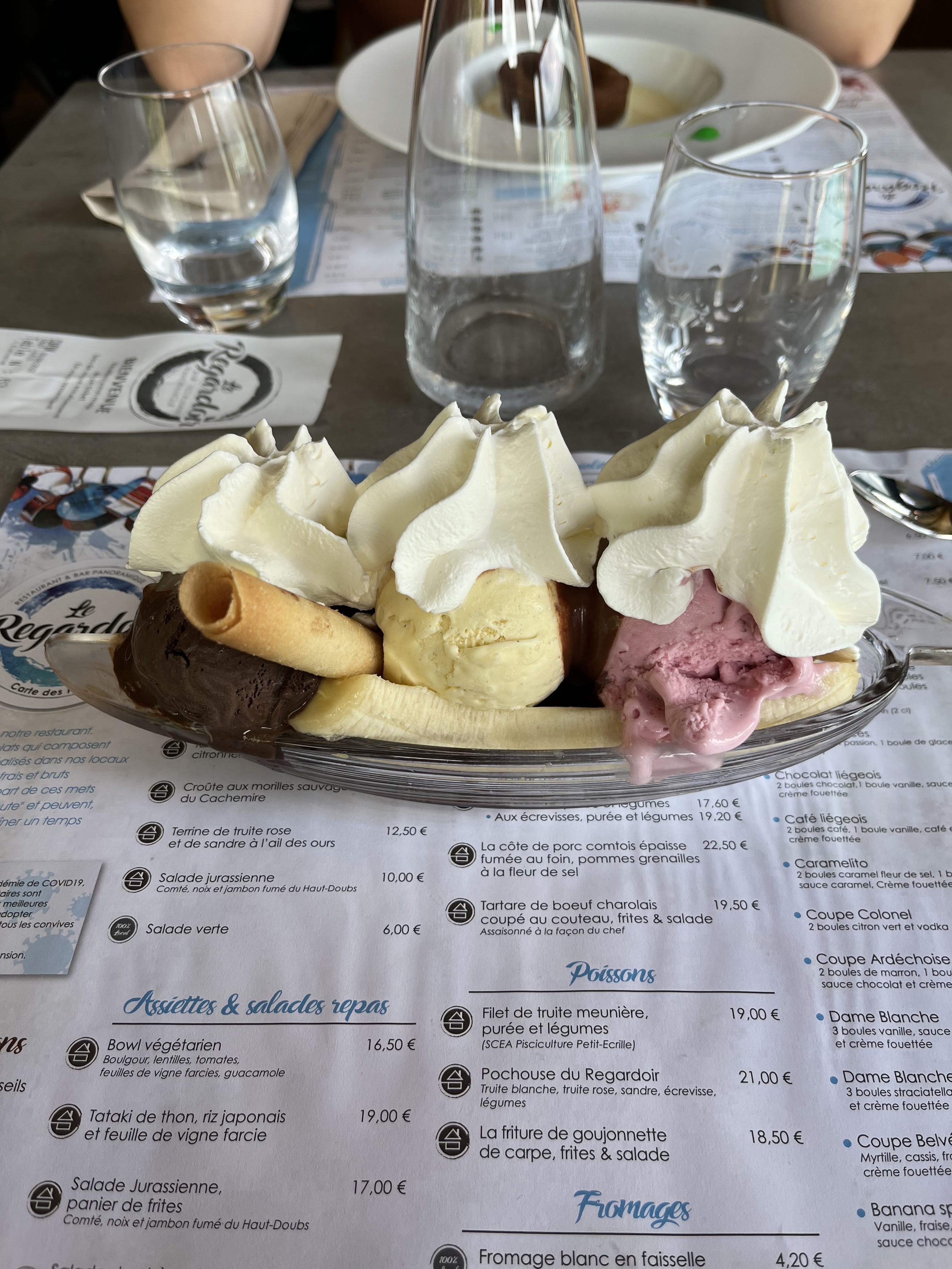 Réservé 10 jours à l'avance pour espérer avoir une table à la fenêtre. Ce fut le cas ! Une des plus belles vues que j'ai pu avoir pour un restaurant qui propose un menu du jour complet pour 16,5€ (assiette de charcuterie, brochette de bavette et un dessert). Les petits budgets sont donc les bienvenus. A souligner, la boîte jurassienne est très bonne (un fromage au four, une brochette de patates / saucisse de Morteau et une petite salade). Idem pour la quenelle de brochet (mériterait un peu plus de riz). Les desserts (glaces) avaient l'air royales. Service sympa et relax avec les enfants, pour qui le menu enfant est de bonne facture (fish and chips et pommes frites en rondelles). Après une balade d'une heure sur le lac en petit bateau électrique, vous y clôturerez une belle matinée.