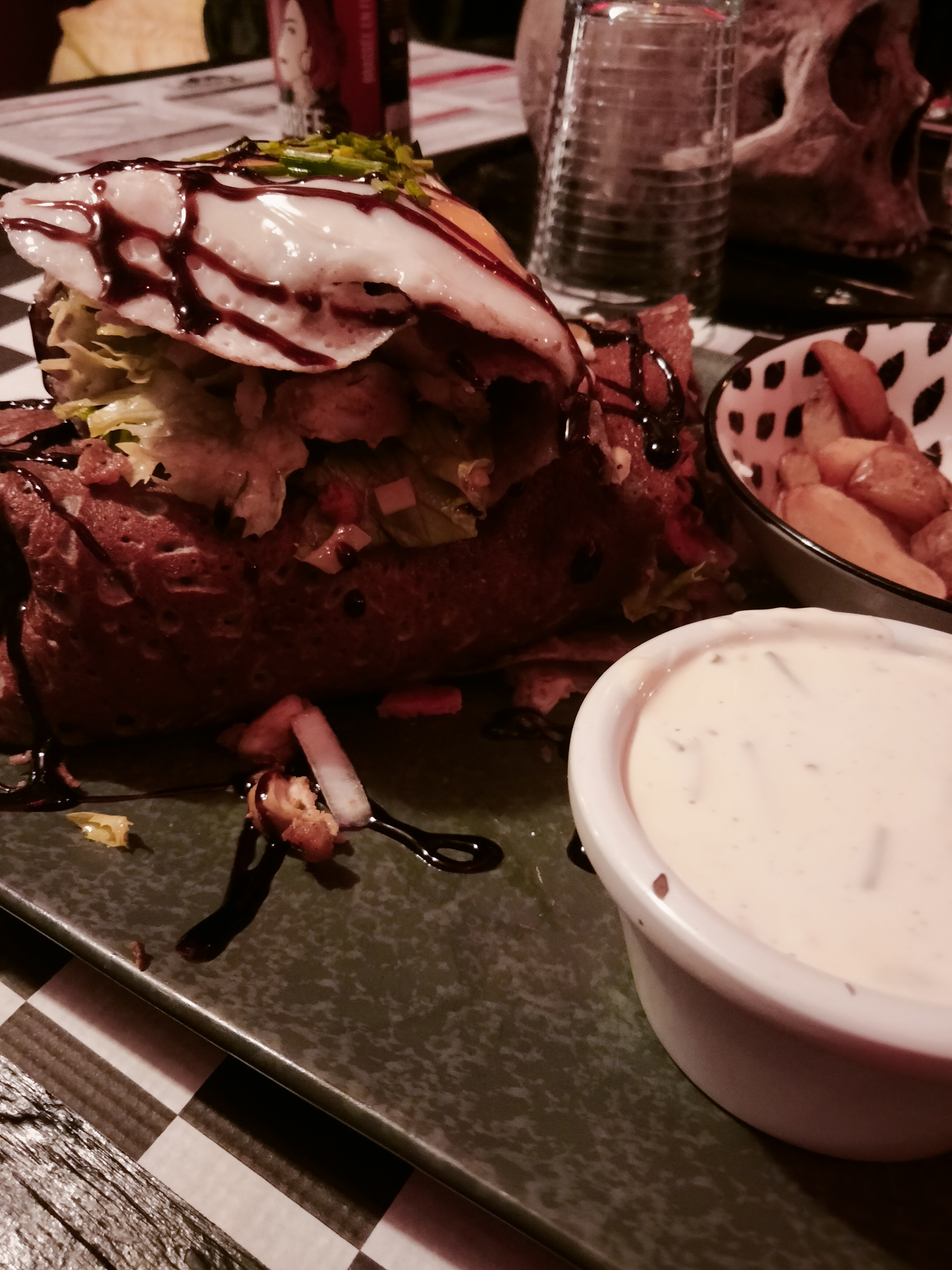Très bon repas avec un burger blini, original et savoureux ! Ambiance super sympa, avec un côté bar metal pirate, c'est très cool. Et la reprise en métal allemand de wham a refait ma soirée, merci beaucoup pour ce classique de Noël :)