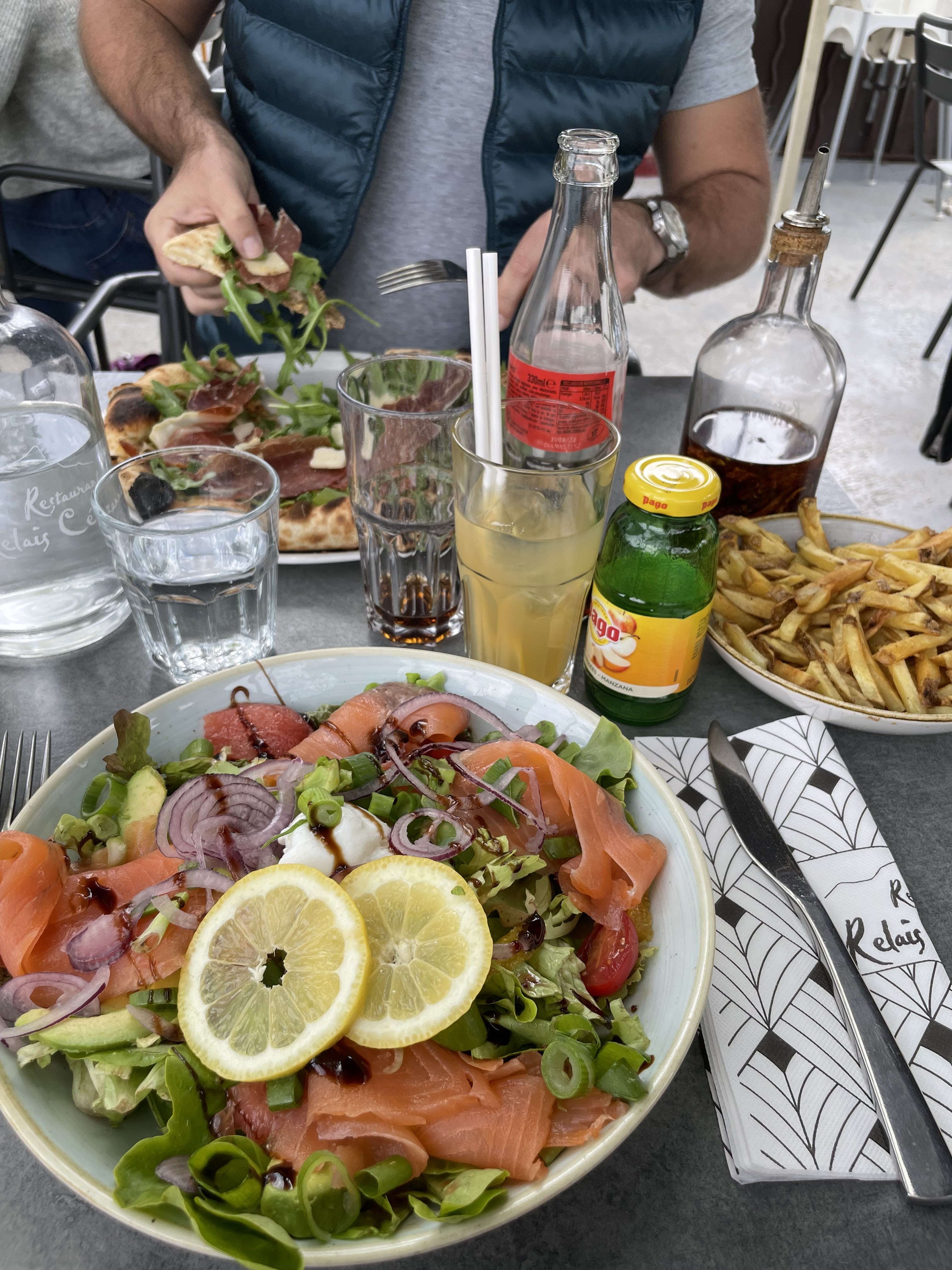 Nous avons choisi de manger le midi avec mon mari dans ce restaurant. Il a fait beau la petite terrasse était appréciable. Juste un peu dommage que par temps de vent les parasols ne protègent pas des chutes des arbres dans l’assiette. Mon mari a aimé sa pizza c’est vrai la pâte était bonne ainsi que les ingrédients. Pour ma part j’ai choisi une grande salade au saumon ainsi que des frites. La salade était bonne mais la main a été un peu lourde sur la vinaigrette. Dommage du coup ça a été difficile de finir mon assiette. Concernant les frites c’est toujours très appréciable d’avoir des bonnes frites maison merci pour ce petit moment ☺️👍