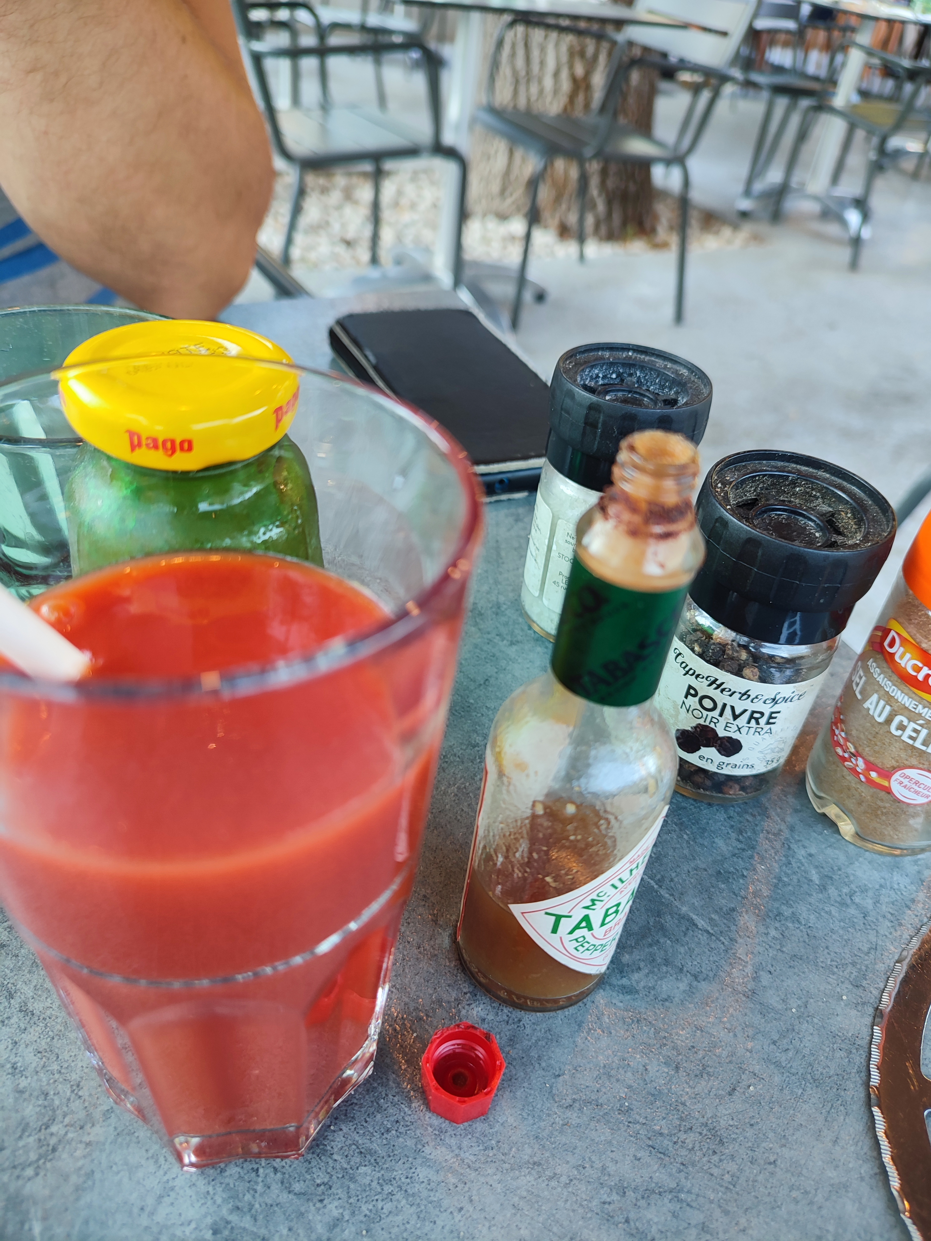 Visite imprévue dans le village, l'ambiance estivale nous invitait à rester manger. La carte est un peu cher soyons honnêtes, mais la pizza 14€ était généreuse et bonne. Dommage que l'entrée en matière soit déceptive à ce niveau de prétentions. Je prends souvent un jus de tomate. Et comme souvent le tabasco c'est souvent un vieux fond de pot qui traine depuis quelques temps... Mais là il faut croire qu'ils l'ont rallongé à l'eau et petit conseil nettoyez la bouteille... Cf photo. J'ai donc demandé une autre bouteille de tabasco qui n'avait étrangement pas la même couleur. Tickets restaurant refusé le soir.