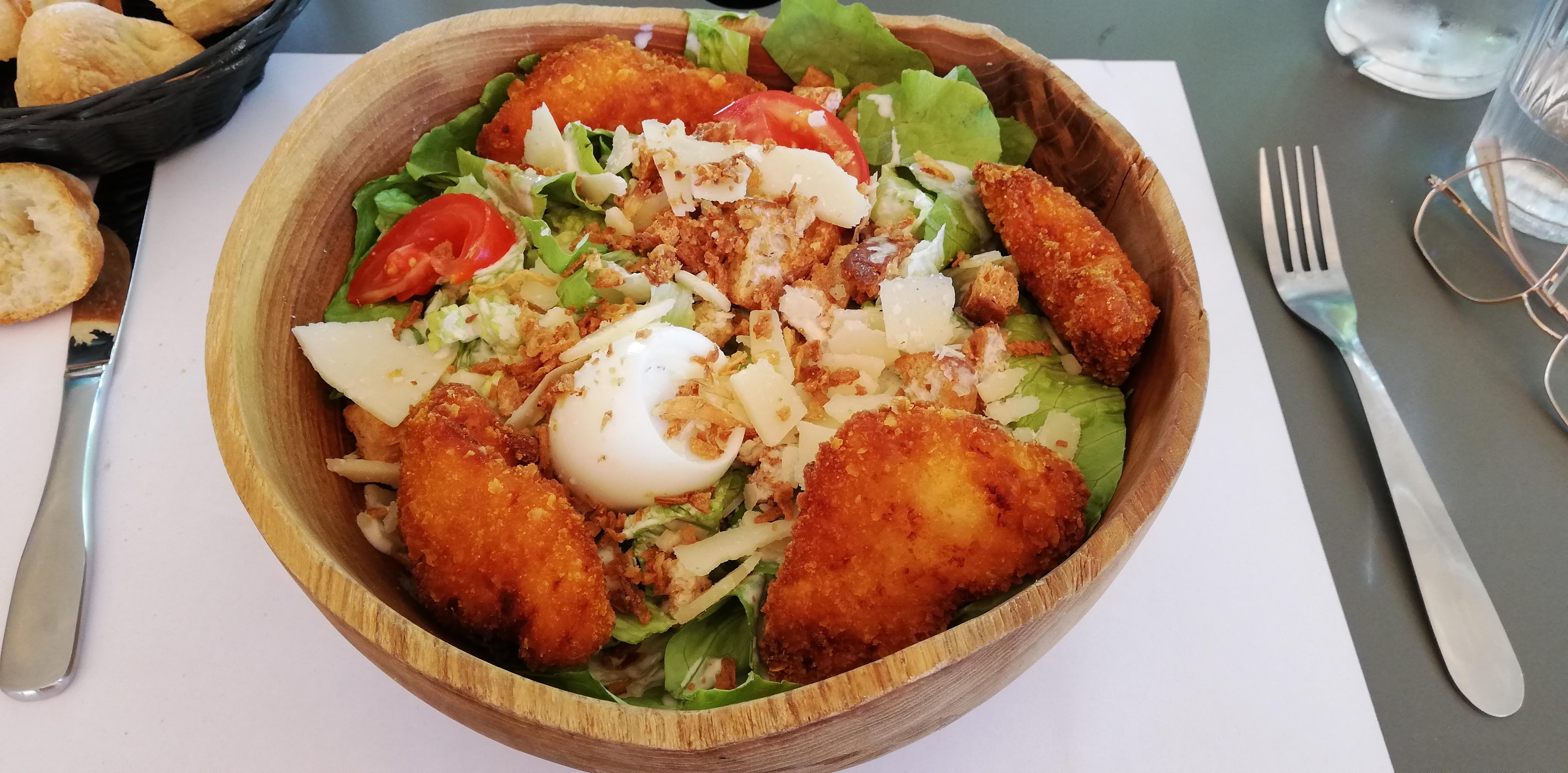 Côté bar terrasse près des boules. Salade césar ni faite ni à faire. de la salade et de la salade, du poulet pané surgelé déséché, trois demi tomates cerises... La sauce supposée maison... Pour le pizzaiolo, il faut contrôler les recettes, le sel ça se pèse, pas plus de 9 ou 10g par litre ou kg de préparation ,sinon c'est in-mangeable, le reste est incipide... Ça dort sur son téléphone mais ça envoit n'importe quoi.. La priorité semble être de faire payer l'endroit, comme toujours, peu importe la qualité de ce qu'on fait.. À bon entendeur