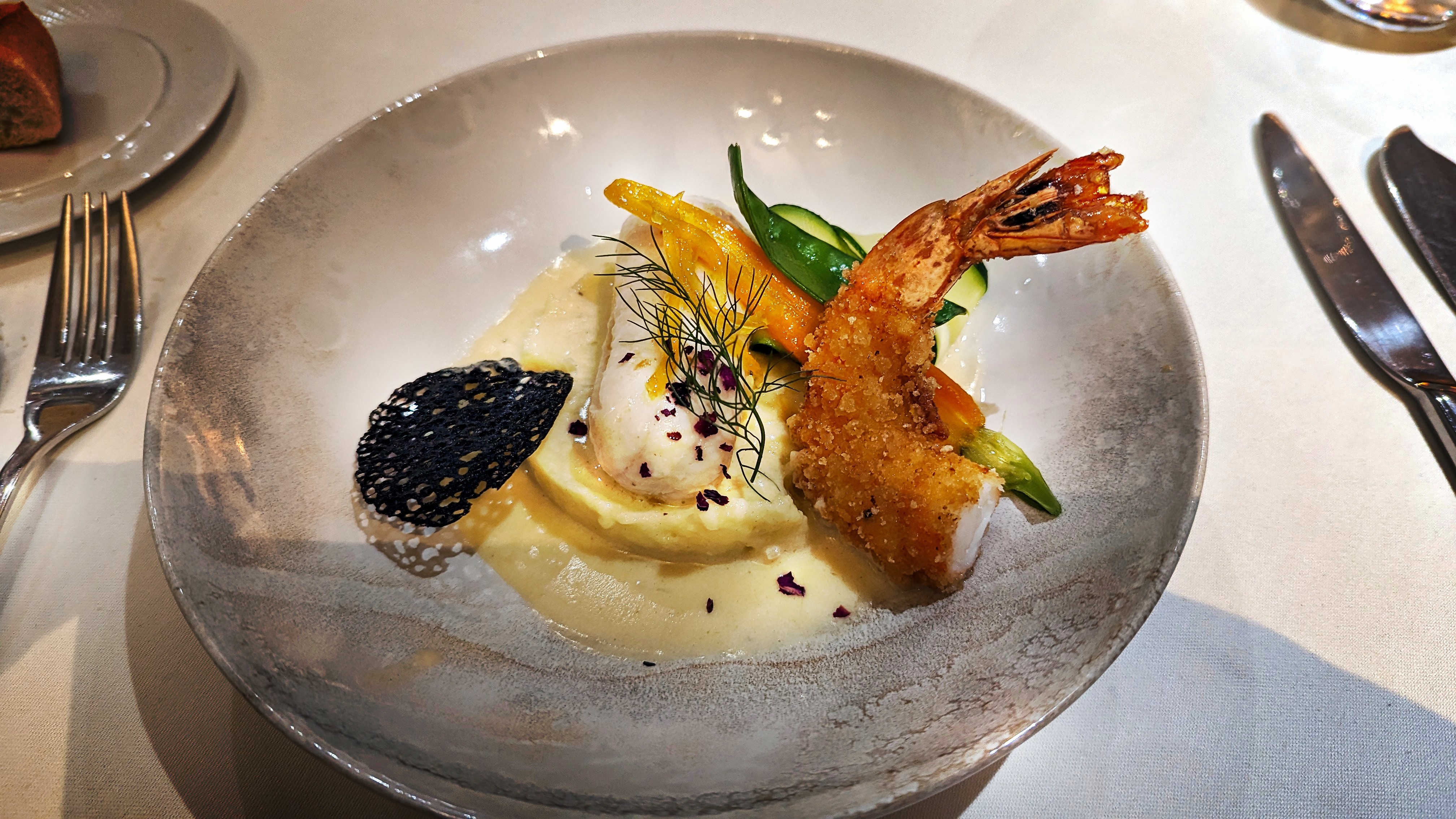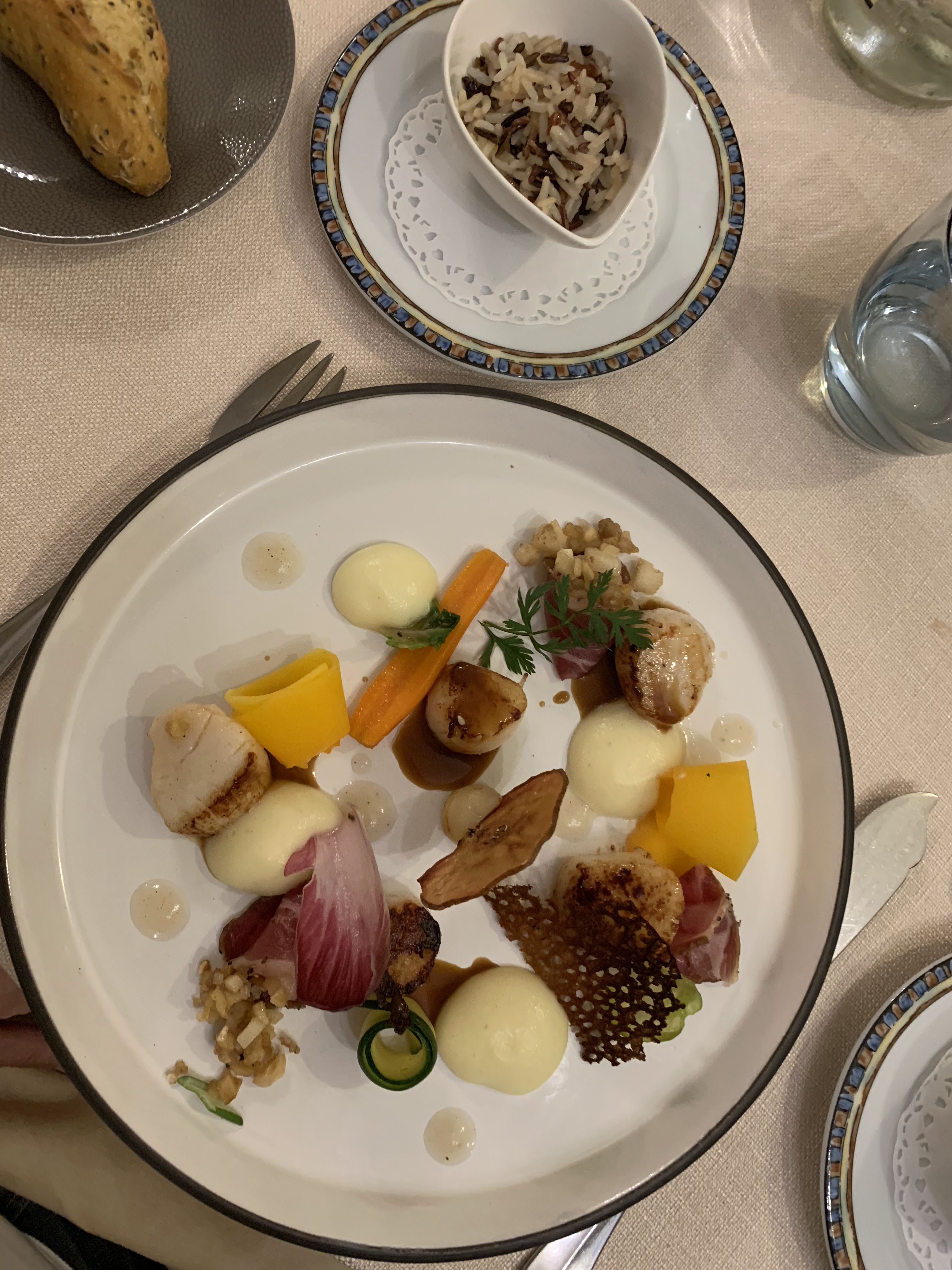 ❝ Plats gastronomiques comme la rosace de St-Jacques dans une salle classique avec nappes blanches et parquet. ❞