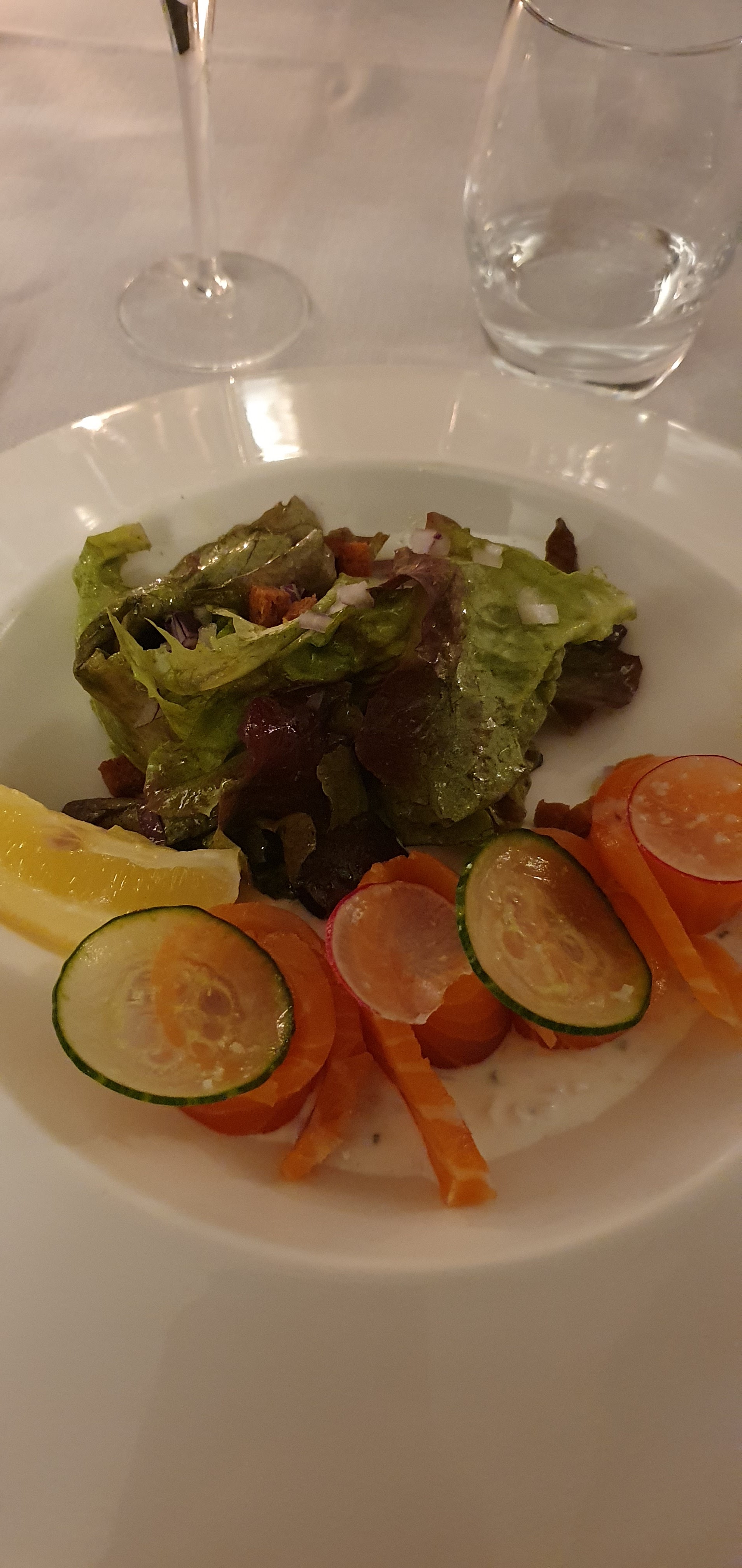Nous avons suivi les suggestions de la carte et pris leurs spécialités : bar entier cuit en croûte de sel puis tarte tatin cuit à la minute. Délicieux ! Et portions très généreuses. Juste dommage d'avoir dû demander 3 fois l'addition et d'avoir attendu 20 min avant de l'avoir, ça a failli être parfait.
