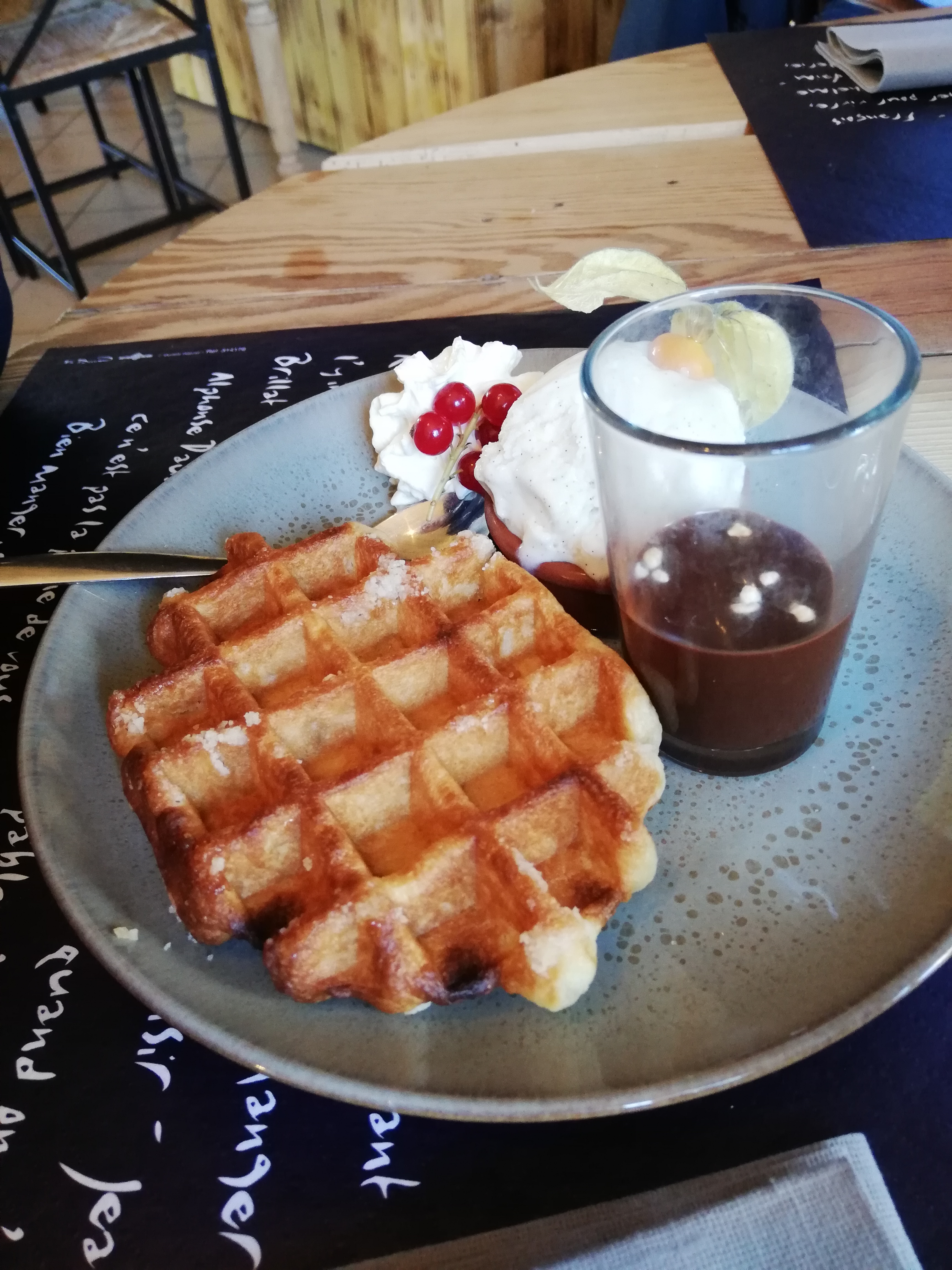 Samedi midi, posés sur la terrasse, l humour subtile et tendre de la serveuse couplé à une cuisine raffinée et présentation irréprochable. Très bel endroit, je conseille !!!!