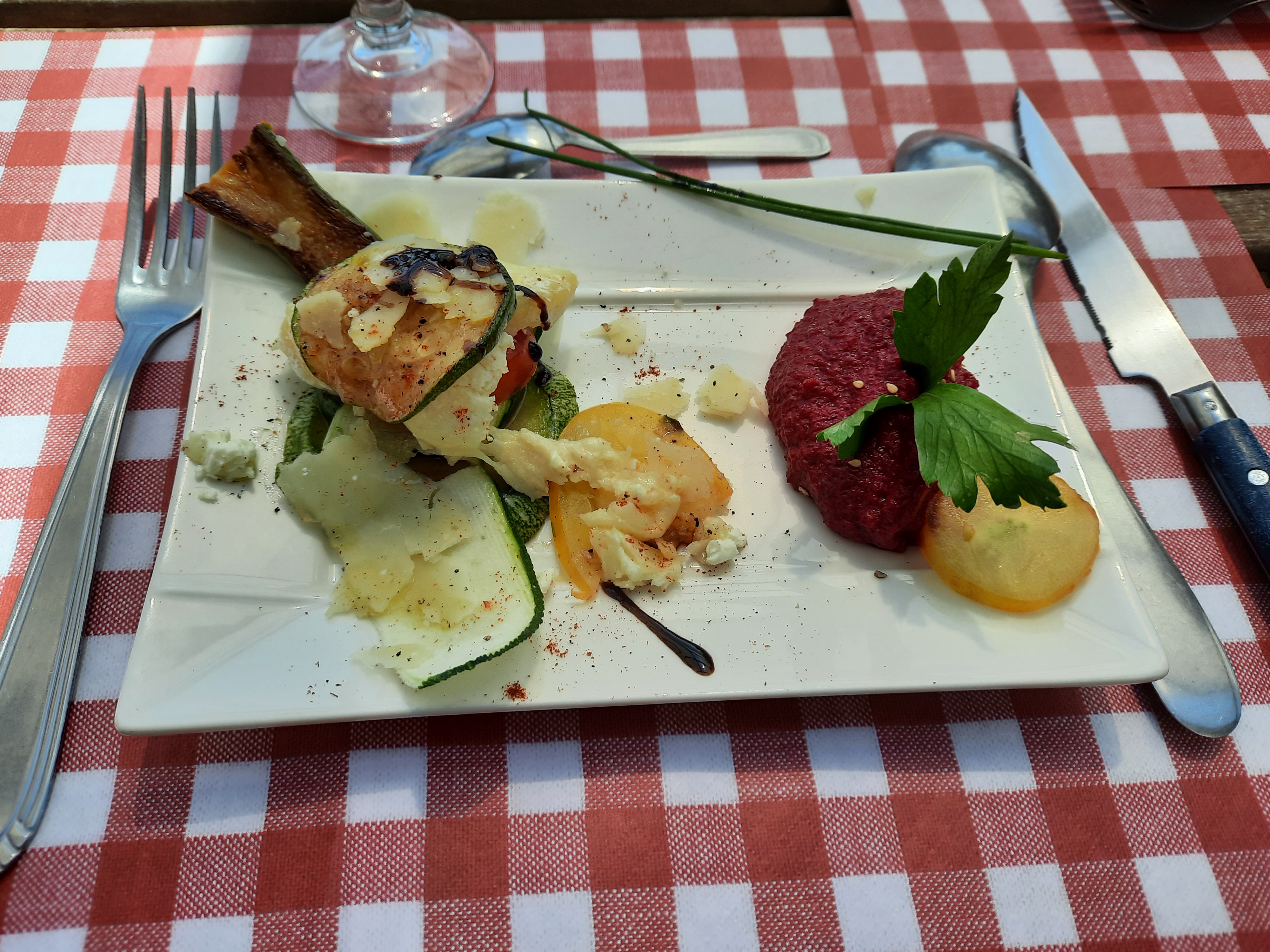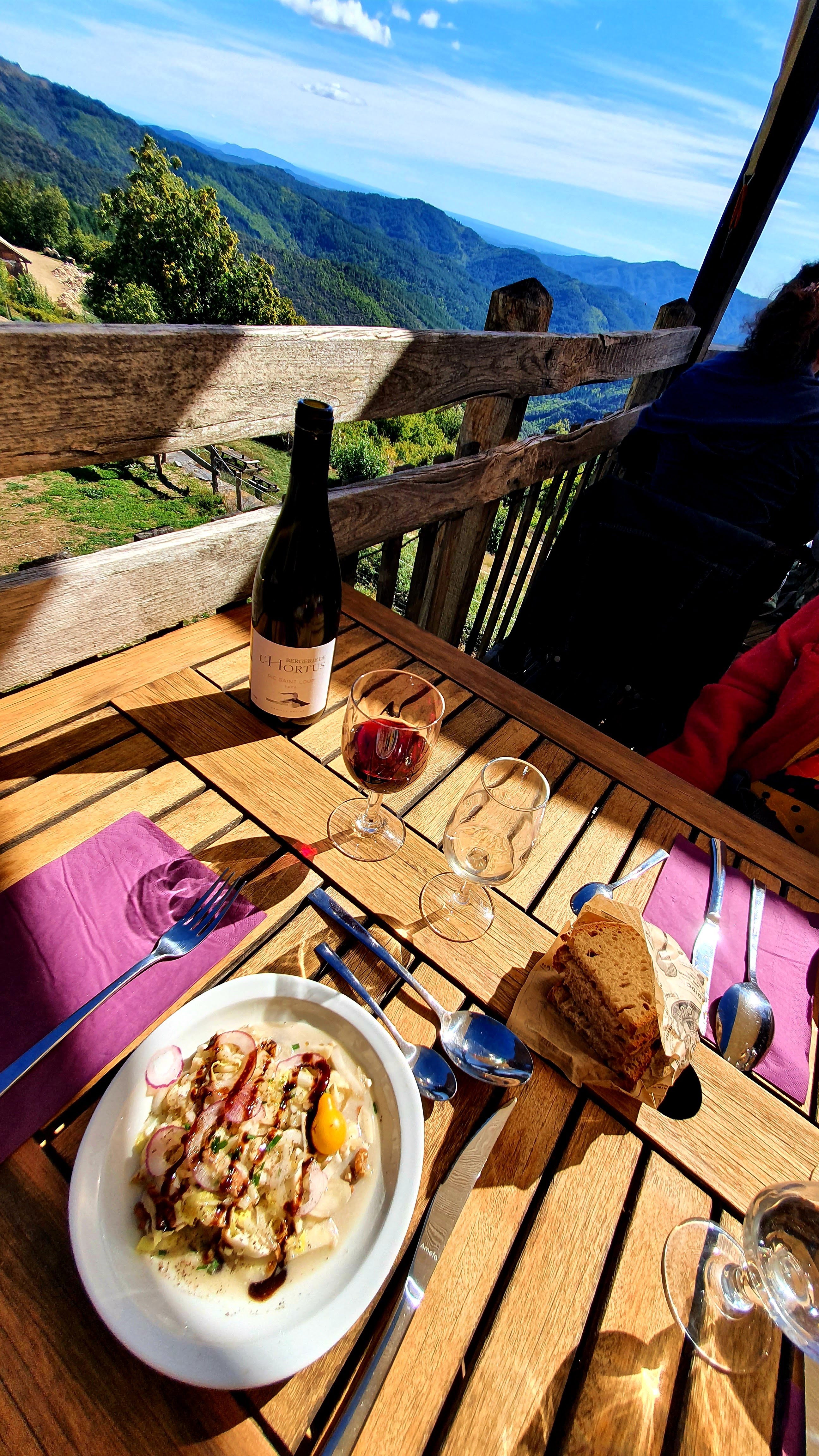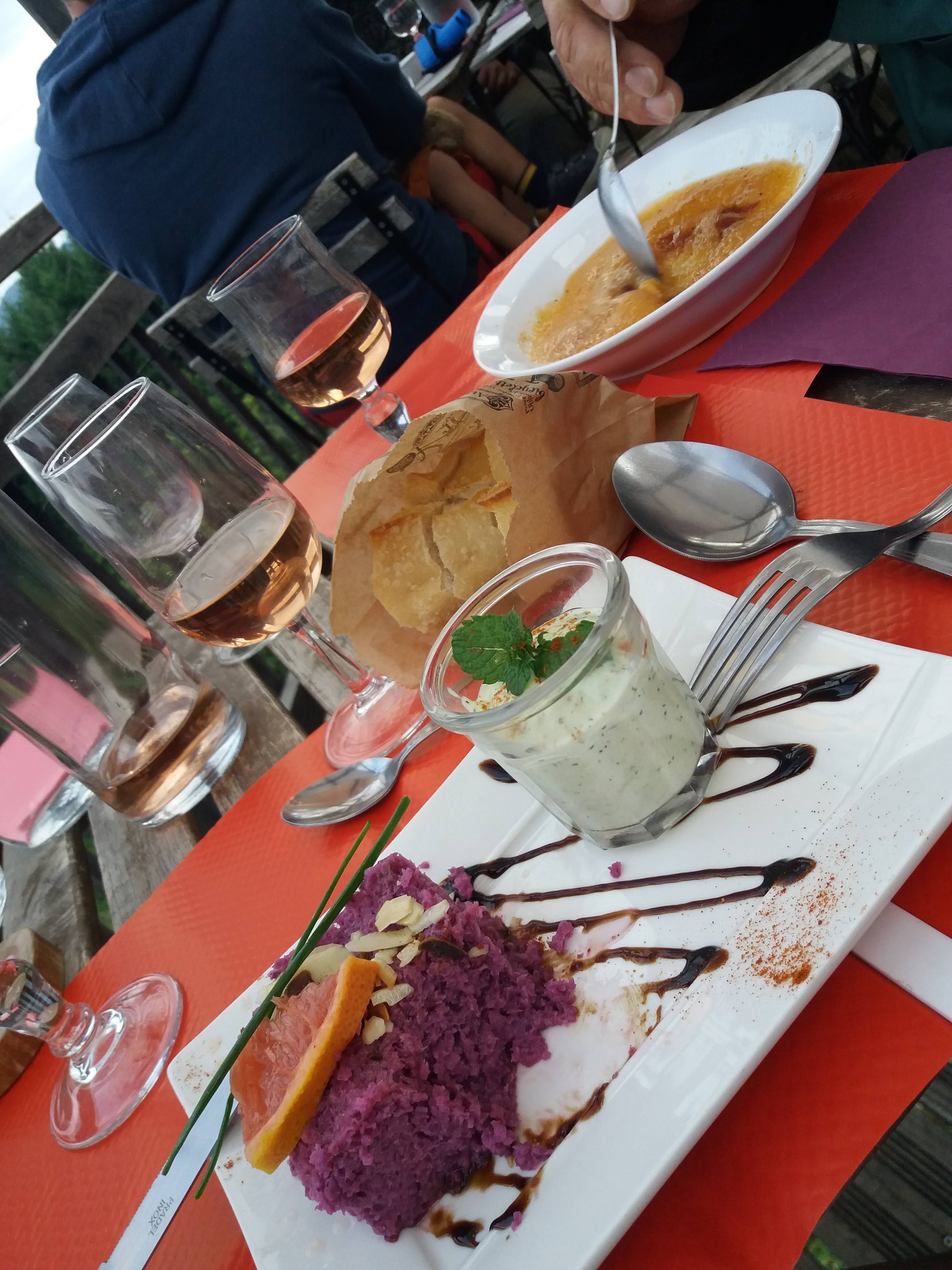 (+++) la vue, la terrasse, le cadre au milieu du parc national <3 <3 <3 (+++) les plats hyper bons et de qualité ! (+) service attentif (+) option végétarienne (oeuf en cocotte) et végétalienne (hummus)
