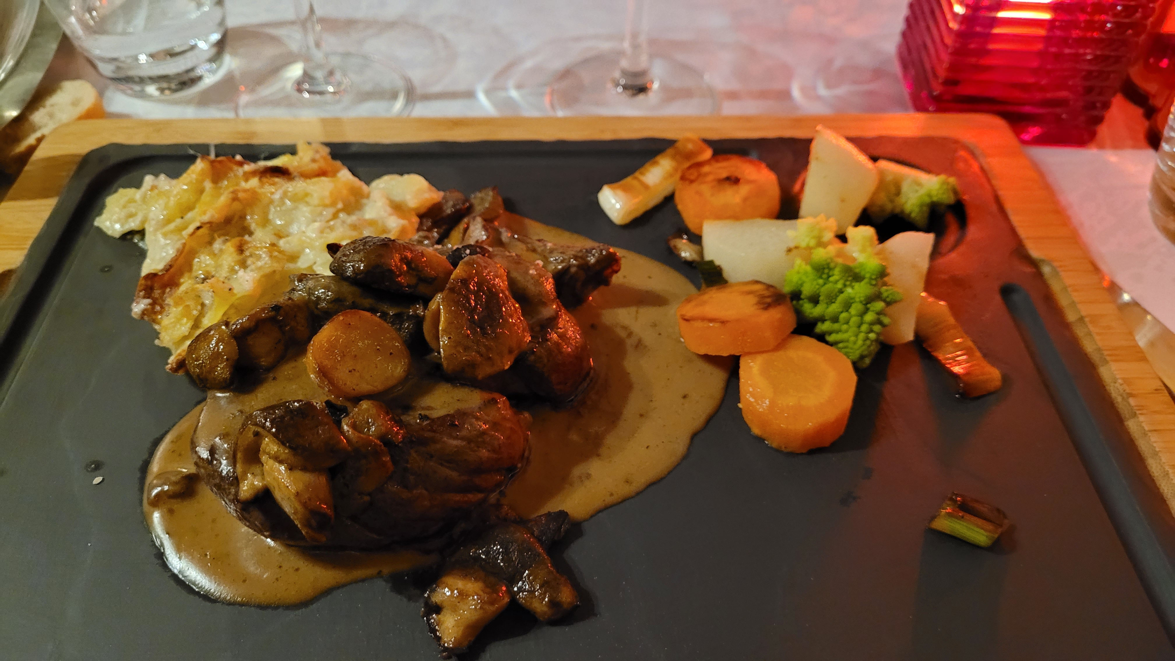Repas très copieux avec du choix et des accompagnements soignés et goûteux. Le menu chasse du moment est fantastique! Mais attention il faut s'accrocher pour tout finir.... Pour 52€ le menu on en a vraiment pour son argent.