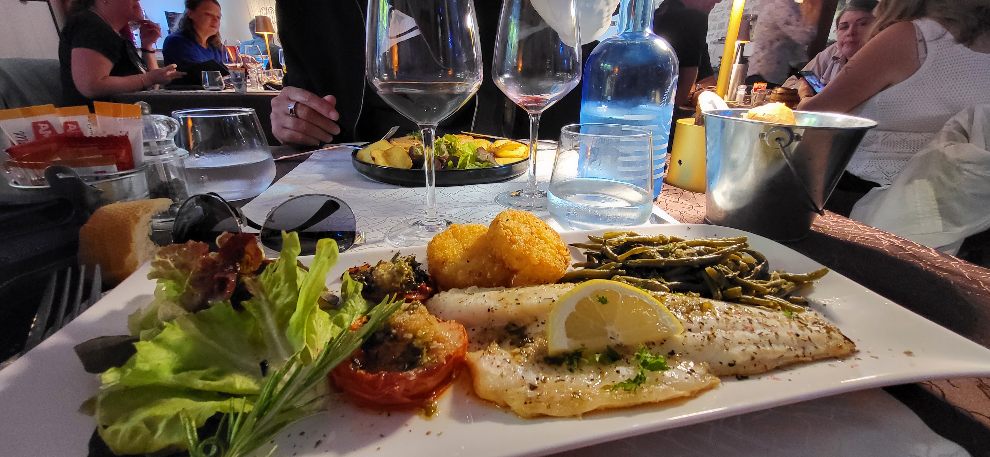 Bonne table avec coucher de soleil. Un accueil malicieux des hôtesses.