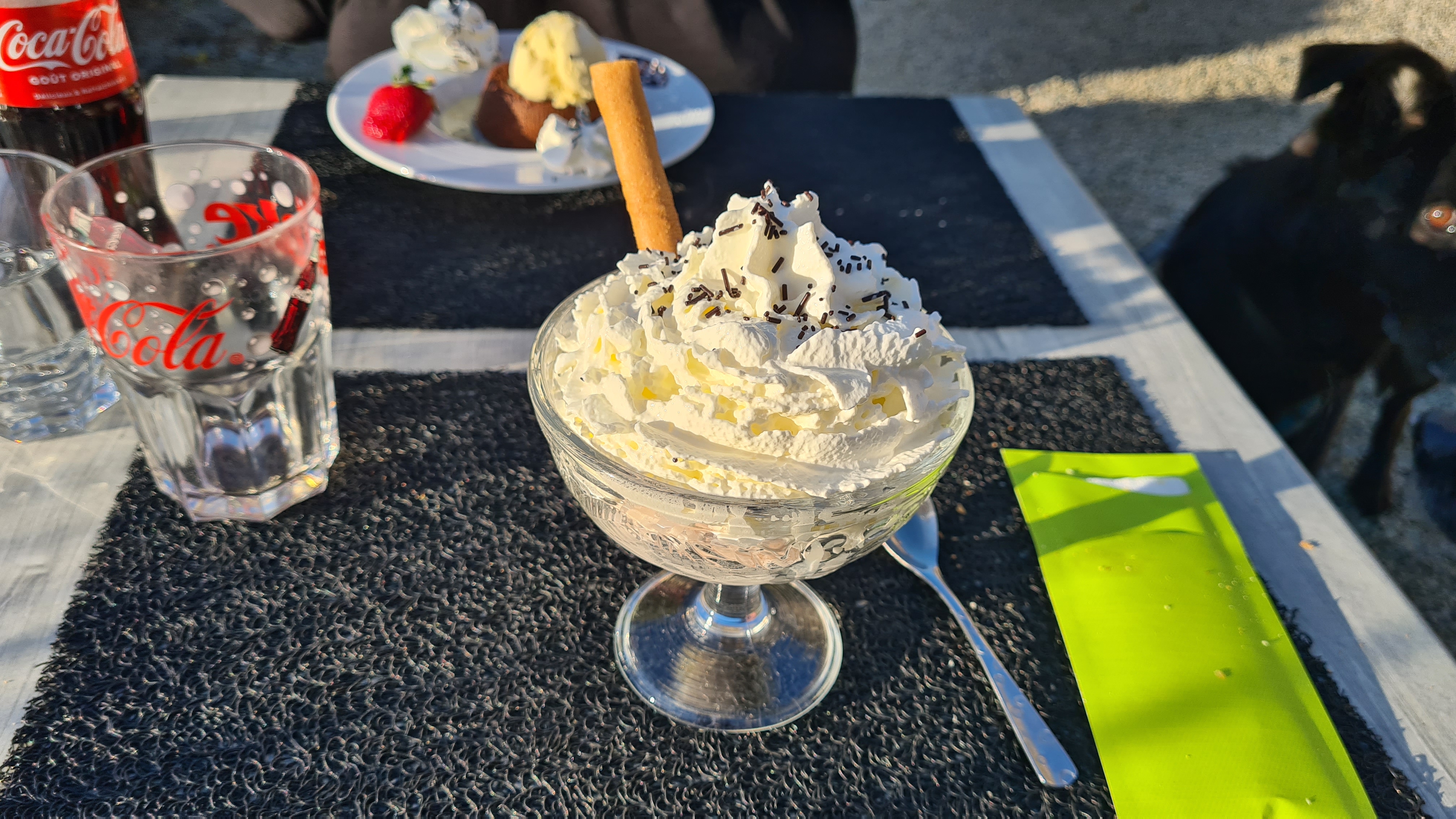 Idéal pour nous en tant que propriétaires de chiens. Les chiens sont non seulement tolérés et tolérés mais bienvenus, même avec un bar à chiens. Nous avons été chaleureusement accueillis et servis avec humour. Manger n'a presque pas d'importance 😜. La nourriture est fraîche et excellente.