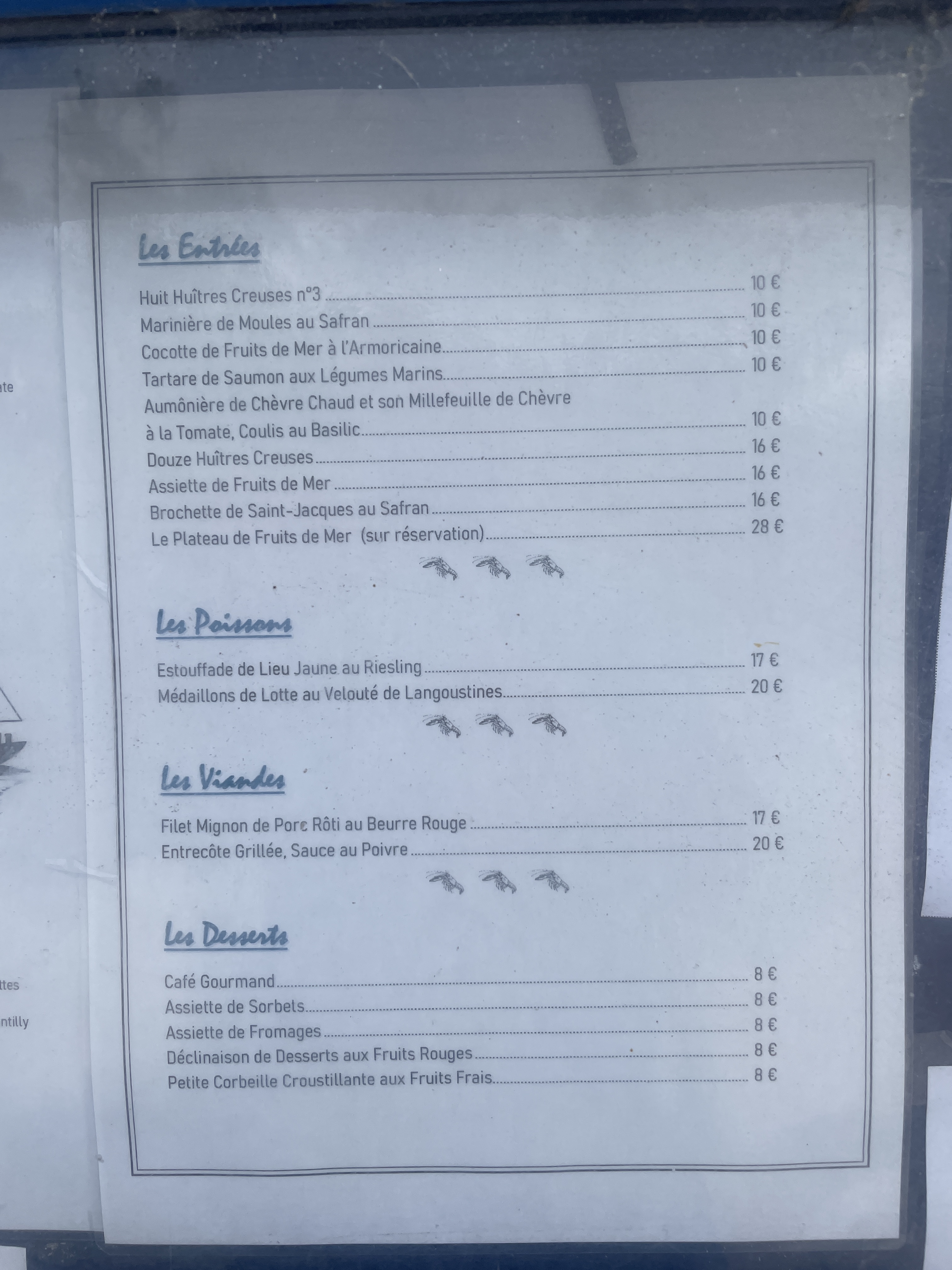 Menu à 35 euros, fruits de mer, entrecôte grillée frites et sauce maison, dessert au top !!! Délicieux de l'entrée au dessert, je conseille vivement !!! Et service impeccable, merci