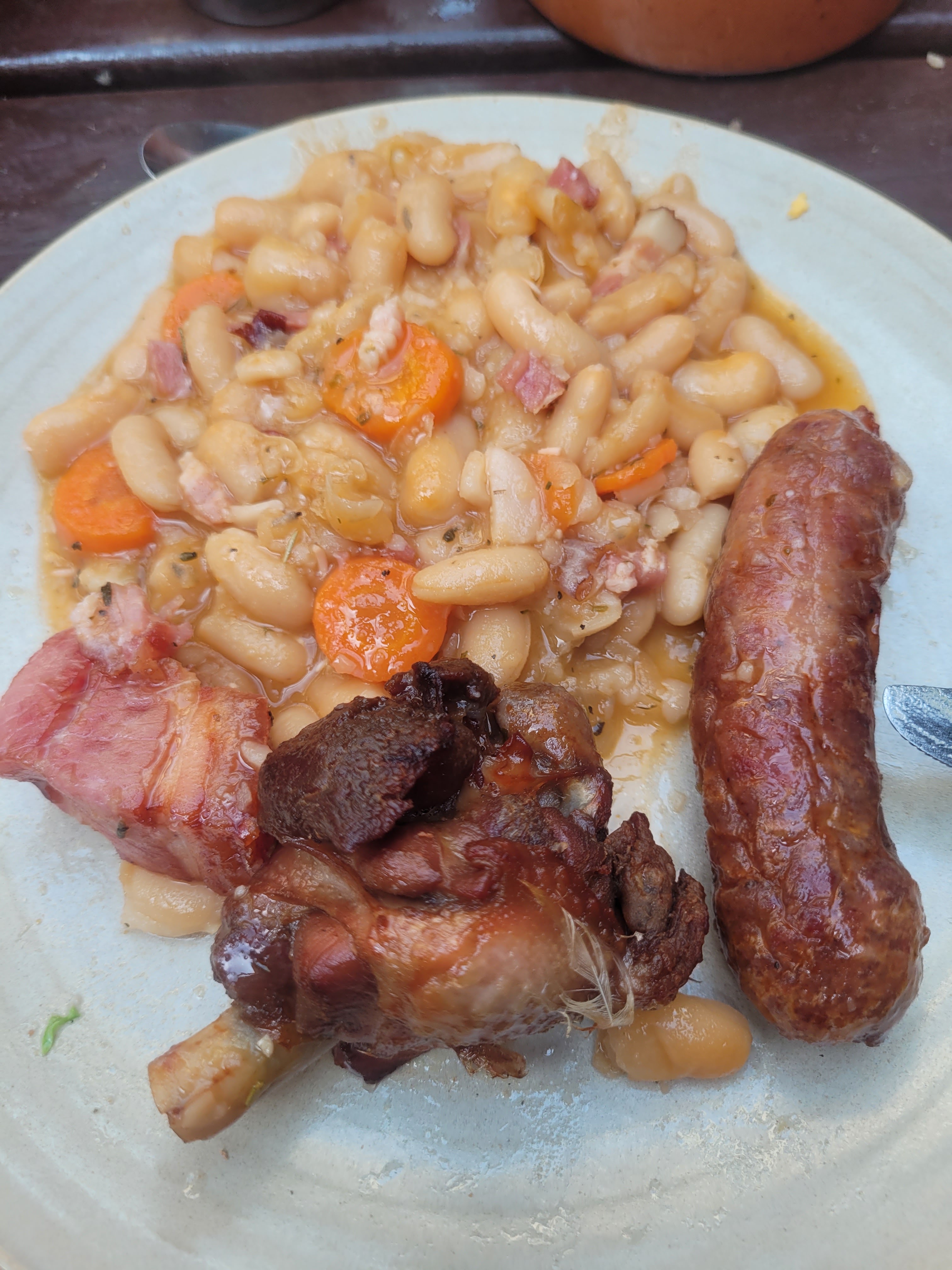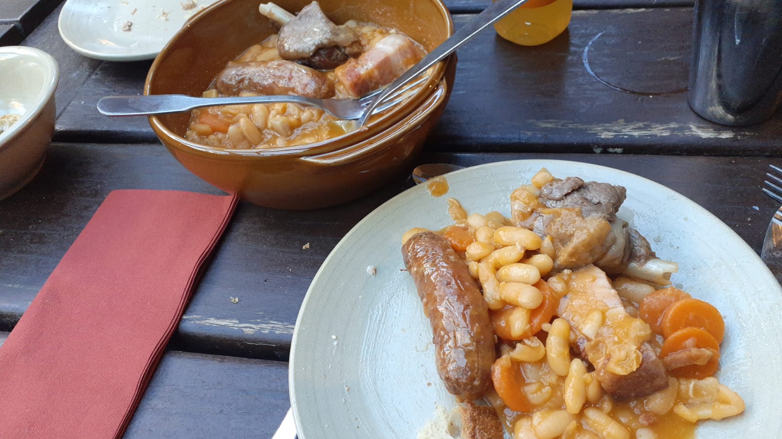 Restaurant bondé , certes nous sommes en Aout... Ambiance musicale qui ne vaut pas comme cependant vantée à la réservation. Vins à volonté mais servis en carafe sans étiquette et de piètre qualité. Menu sans choix possible, ce fut cornichons rillettes (très bonne et pas grasse). Salade. Cassoulet. Gateau brioché et pommes cuites.