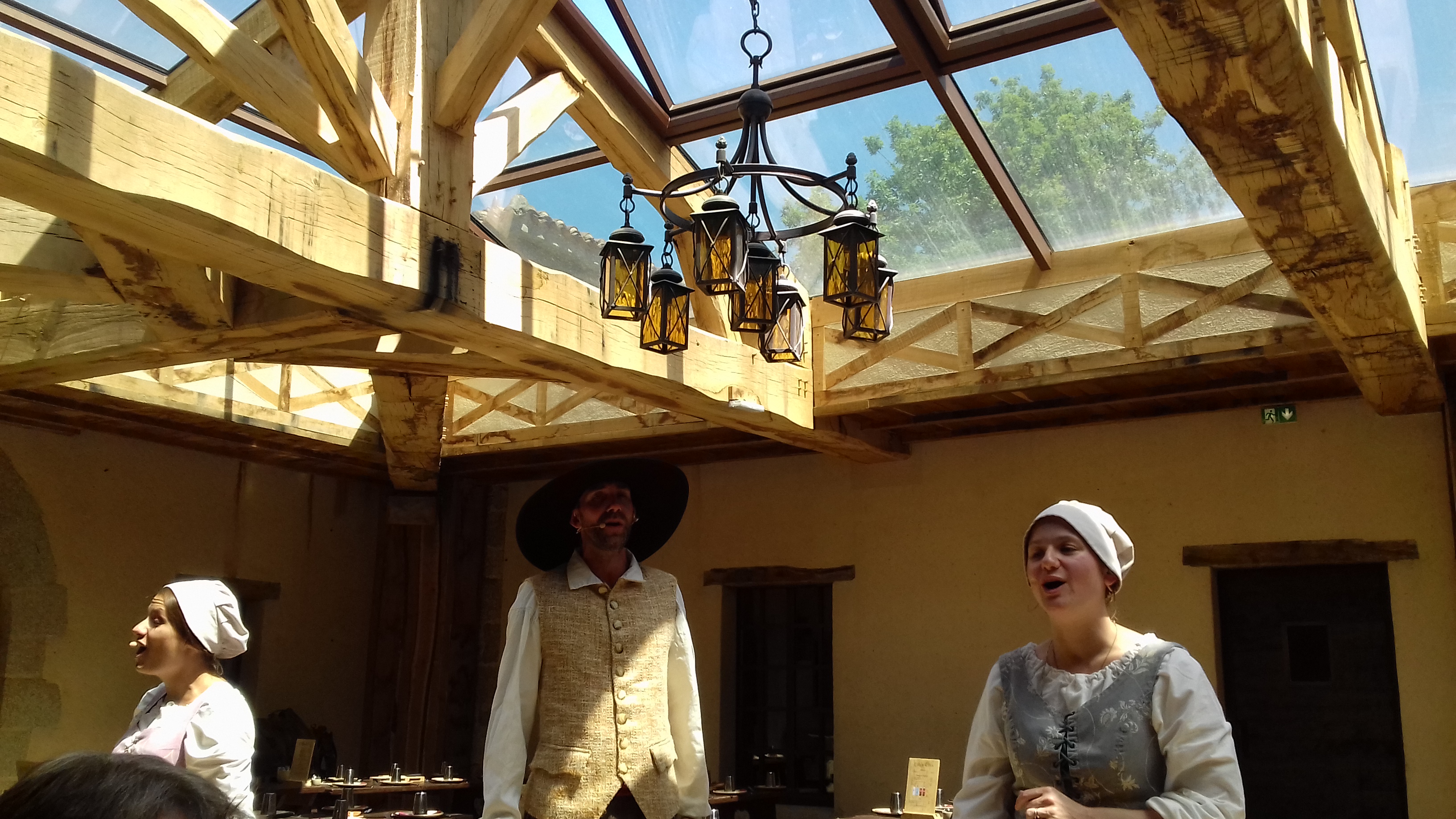Nous avons dîné dans ce «restaurant » hier soir après avoir passé une journée incroyable dans le parc. Quelle déception ! Pour commencer, une vulgaire salade de légumes correcte,passons…. S’enchaîne un cassoulet vendéen absolument abjecte avec saucisses et lard 100% gras,aqueux et donc insipide,dessert pommes à peine chaudes accompagnées d’une brioche baignants dans une pseudo crème anglaise. Du vin digne d’un excellent père Benoît en direct d’une barrique plastique de chez Lidl ou de l’eau du robinet,pour le rayon boisson….Nous commandons deux bières pour espérer apprécier malgré tout un bon moment,10€60 qu’il faut régler immédiatement… Pour saupoudrer le tout,des chanteurs supposés être là pour assurer l’ambiance,entonnant des chants et danses infantiles,plus que moyens…. On est vraiment loin d’un banquet médiéval ! Nous avons clairement ressenti qu’il fallait expédier fissa l’ensemble des pseudos hôtes dont nous avons fait partie ce soir là,une bien piètre prestation au regard de la qualité extraordinaire des spectacles et de l’organisation en général.