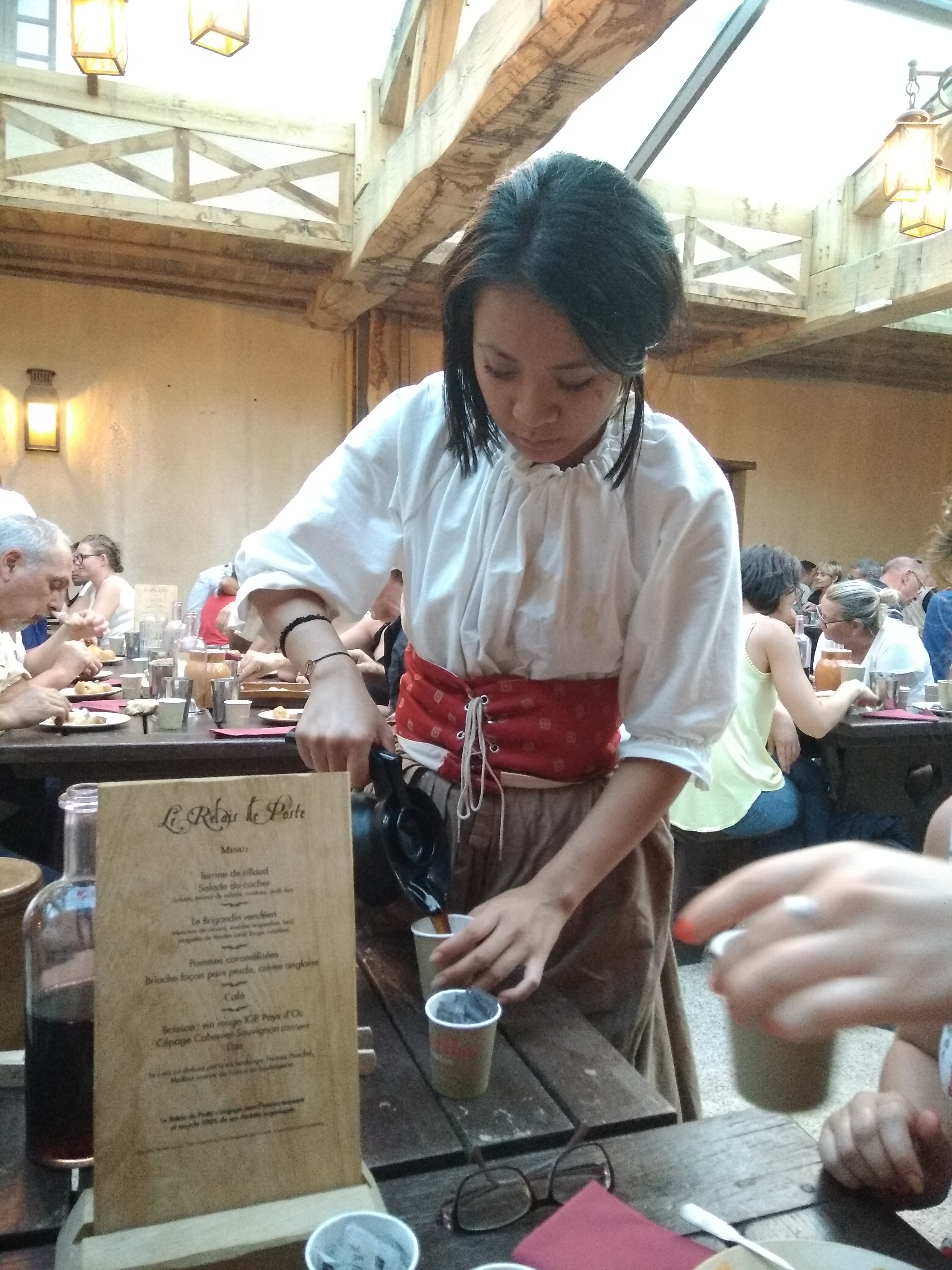 Le restaurant ne correspond pas au standing du puy du fou. Le repas est bon mais simple pour le prix. Il n'y a que quelques chants pendant le repas, loin d'être un restaurant animé. De plus, le service est rapide, il est vrai qu'il y a le spectacle des noces de feu le soir, mais on se sent un peu mis dehors. Pour avoir discuté avec d autres visiteurs, le café de la madelon a l'air quant à lui très bien.