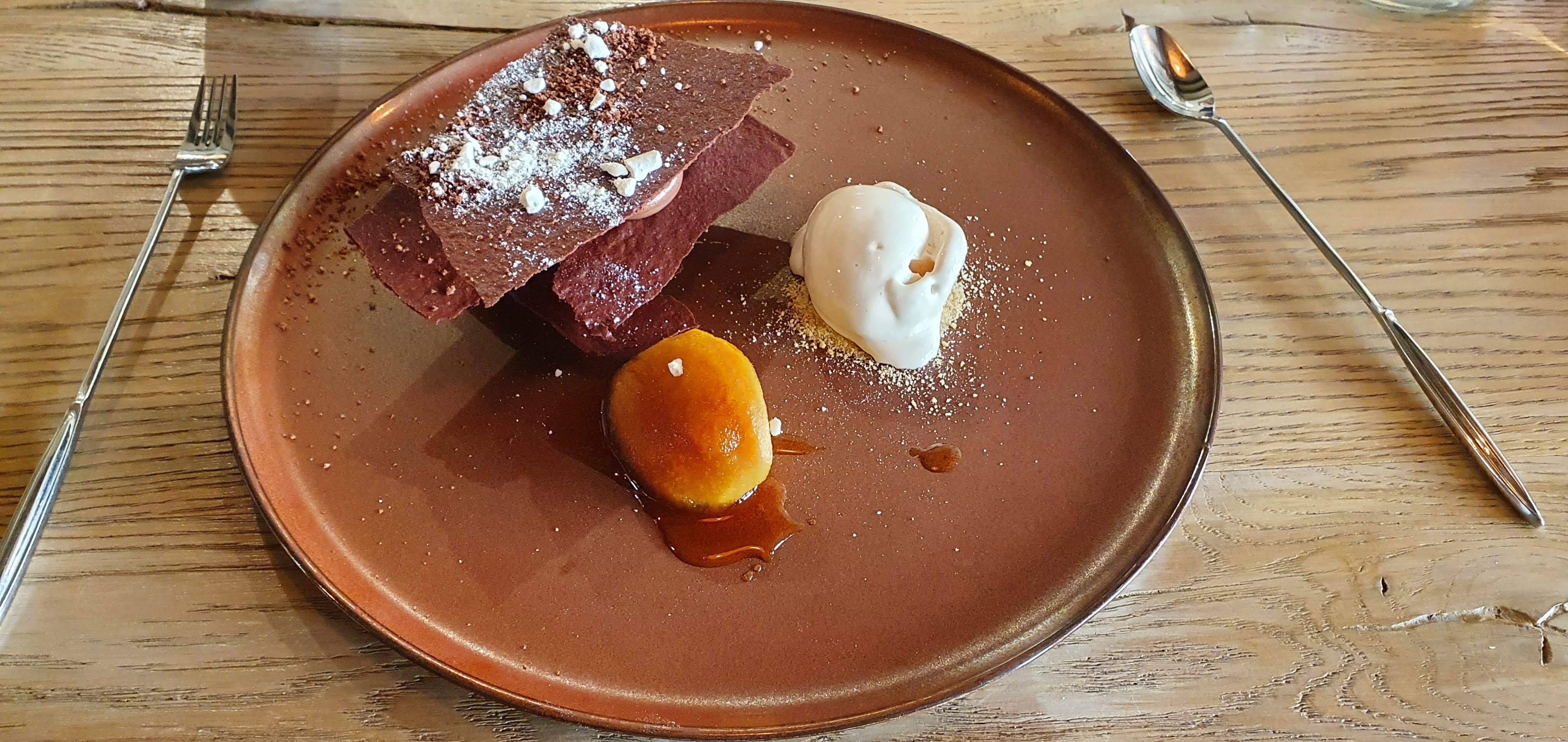 Bon repas. Bien conseillés en vins. Dessert chocolaté un peu trop épuré manquant de couleur, de générosité. Chaises peu confortables, à mon goût. Service manquant d'un peu d'efficacité, de rapidité et de chaleur.