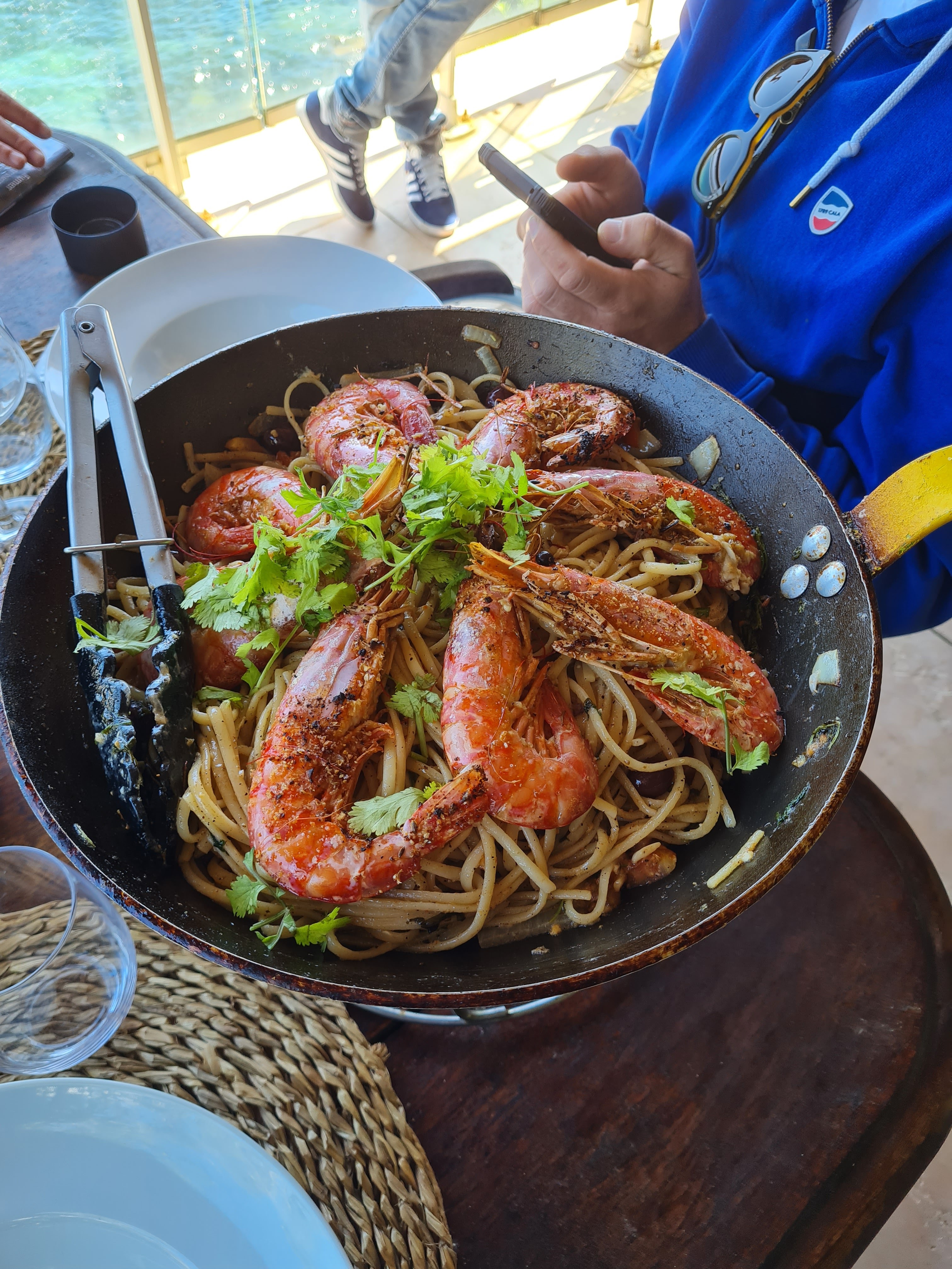 Délicieuses pâtes aux crevettes et raclette au camembert Facon. La vue est incroyable et ils ont été très gentils avec nous.