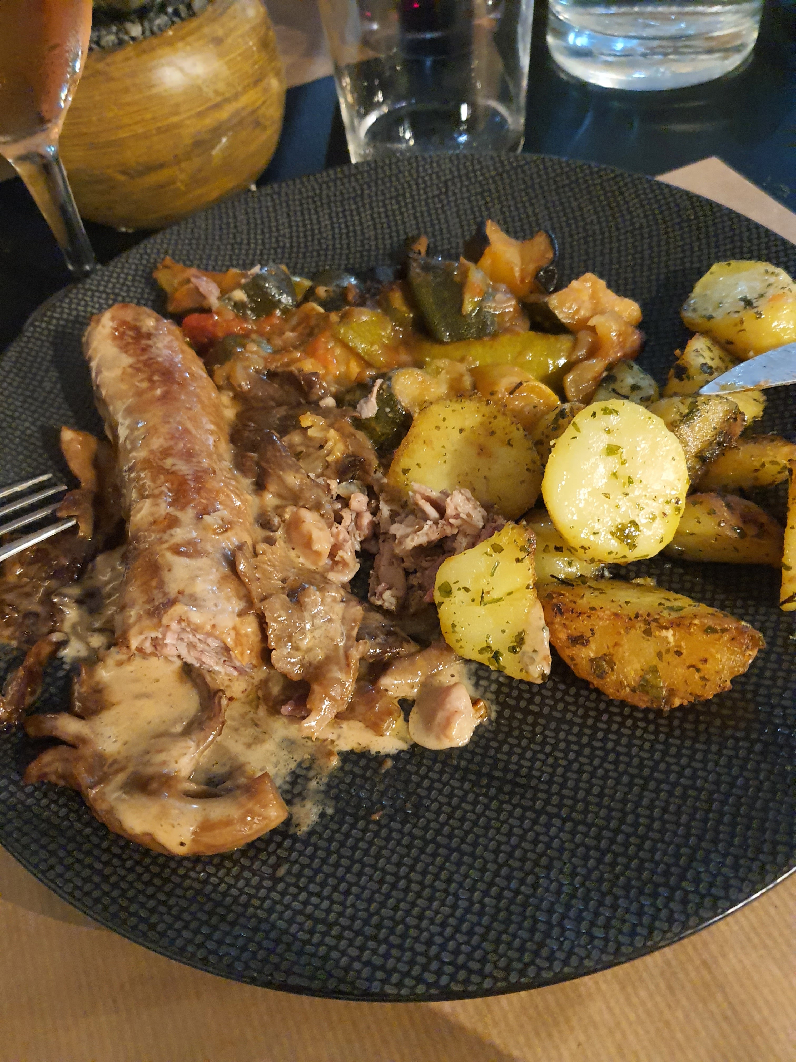 Accueil très agréable avec un repas digne de ce nom !( fait exprès pour les gourmands) Le dessert était vraiment bon (ile flottante pour ma part) et l'entrée (salade avec saumon) n'était pas mal non plus et vraiment bien garni ! De plus, le plat principal avec sa sauce au champignon était exquis !