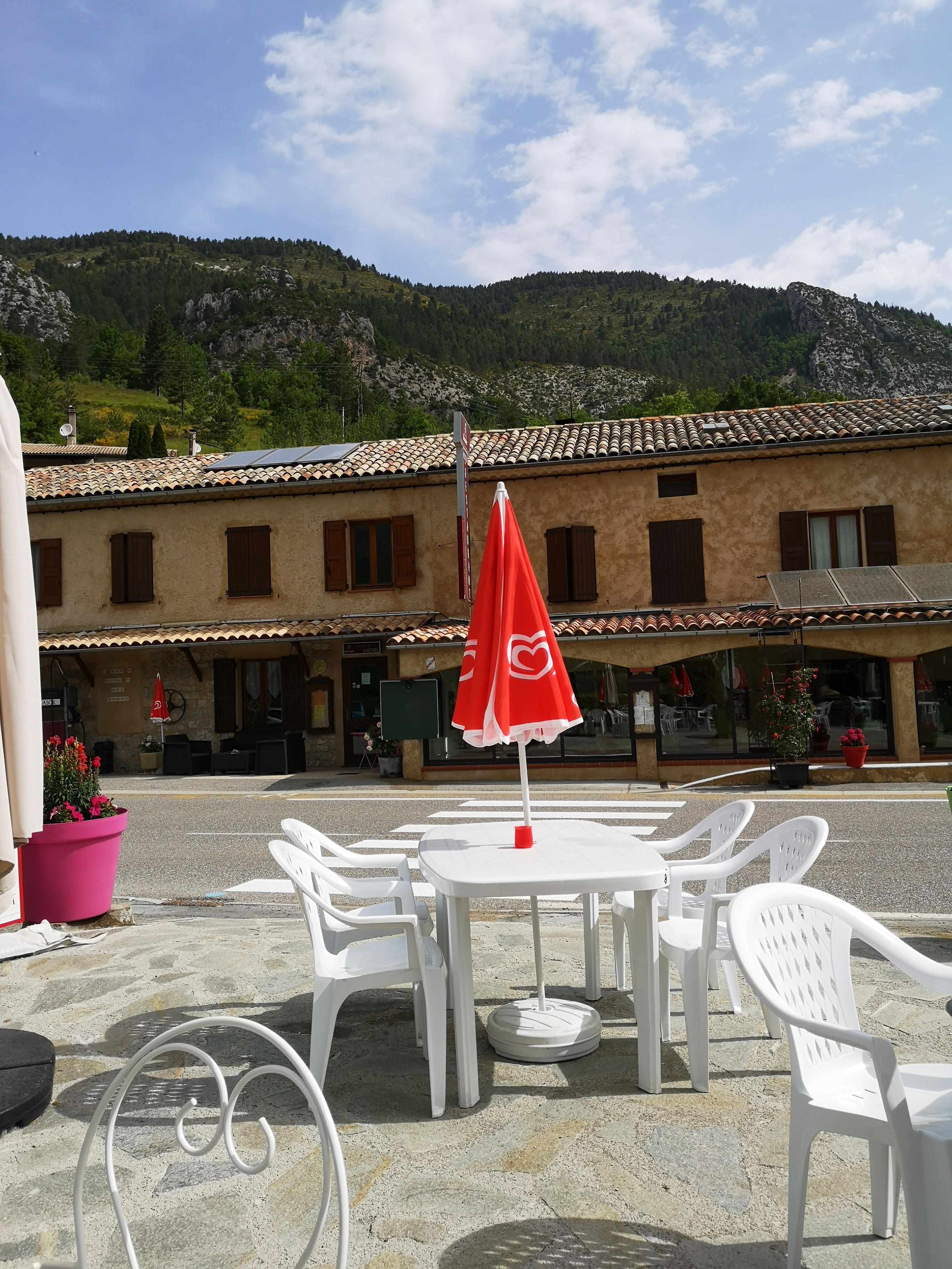 Du soleil , une terrasse de café agréable dans un joli coin vallonné, oui un peu au bord de la route mais le lieu vaut l arrêt.