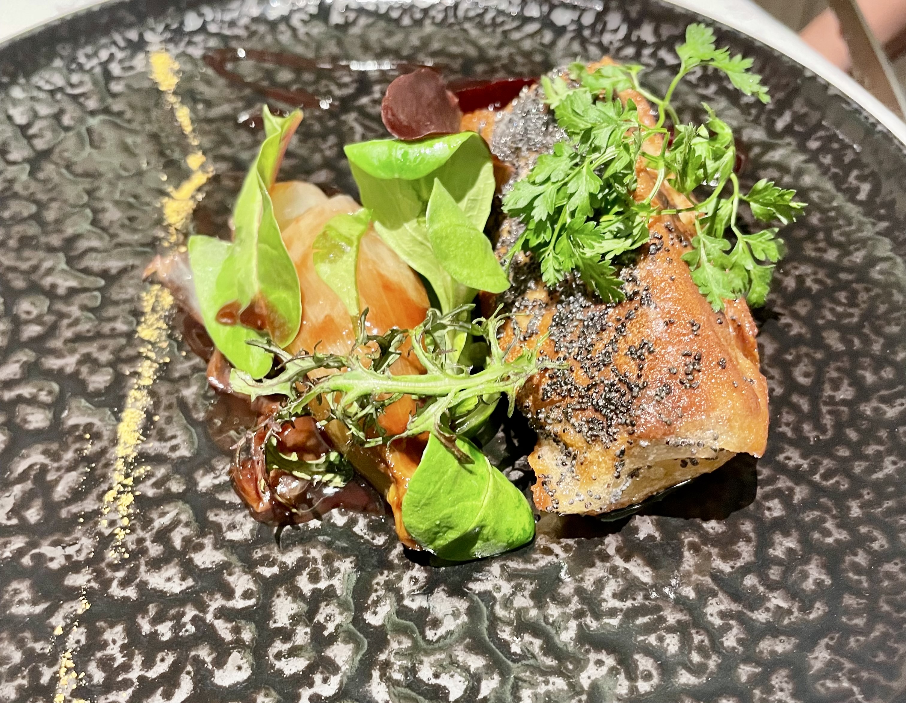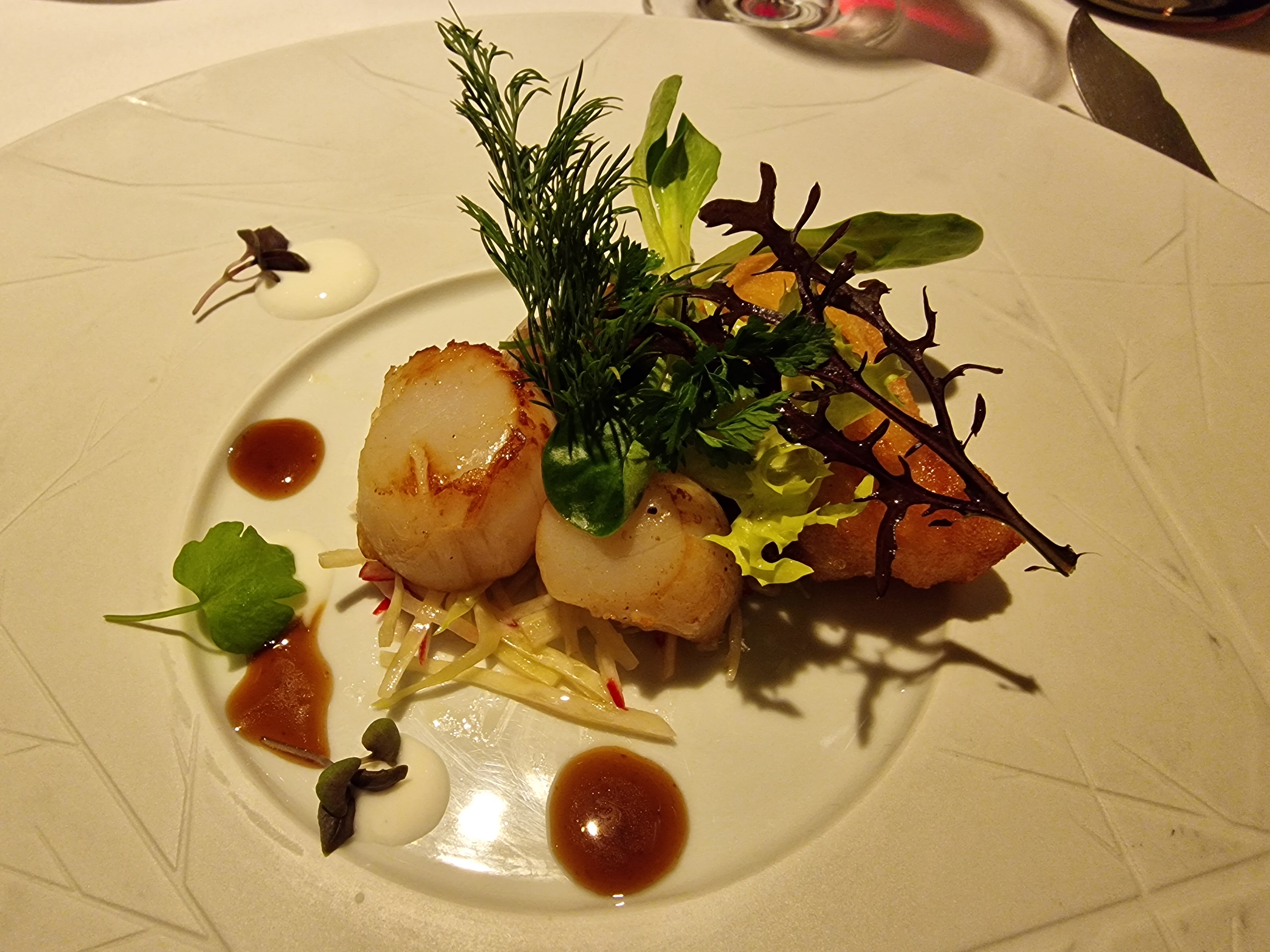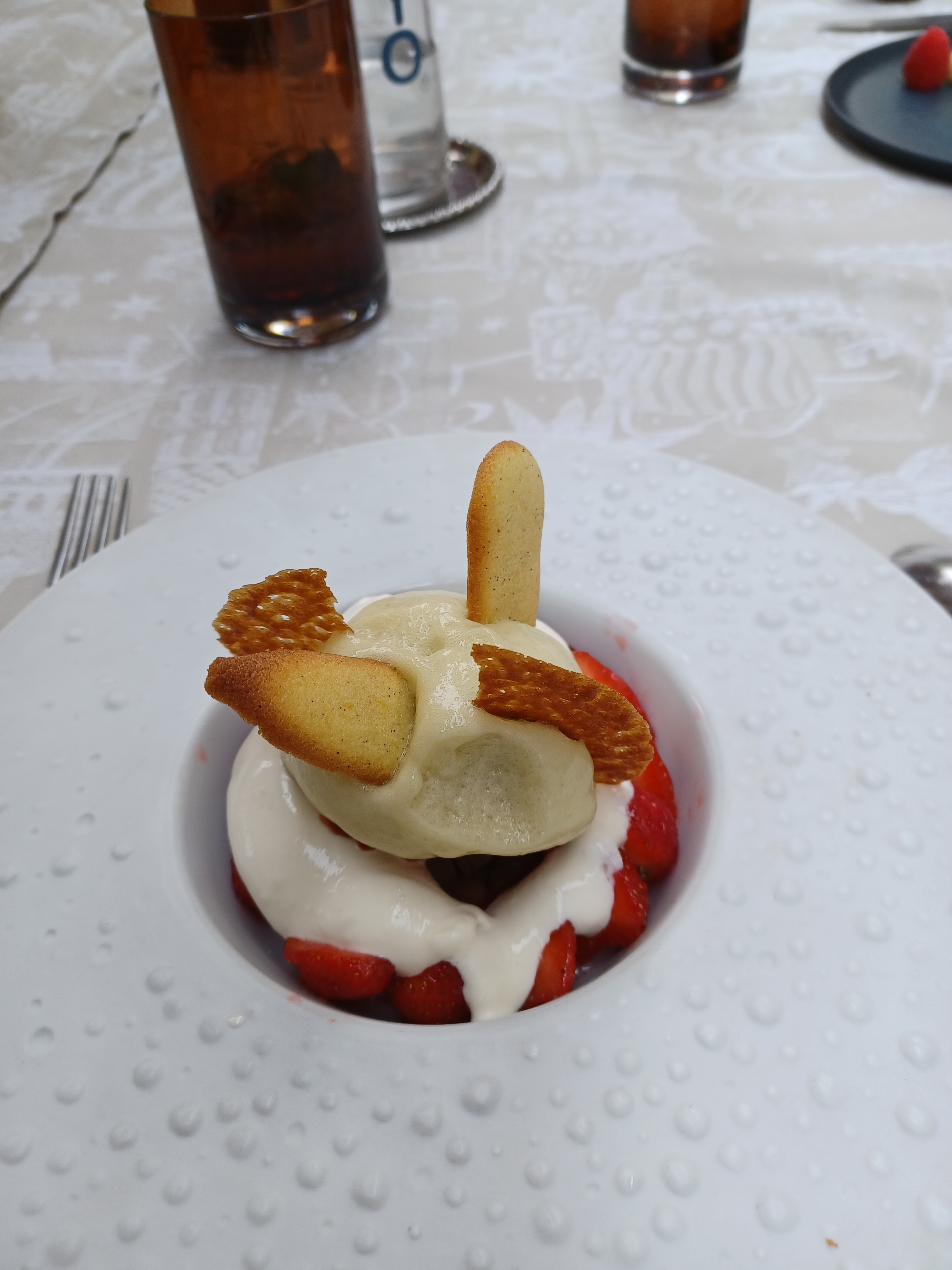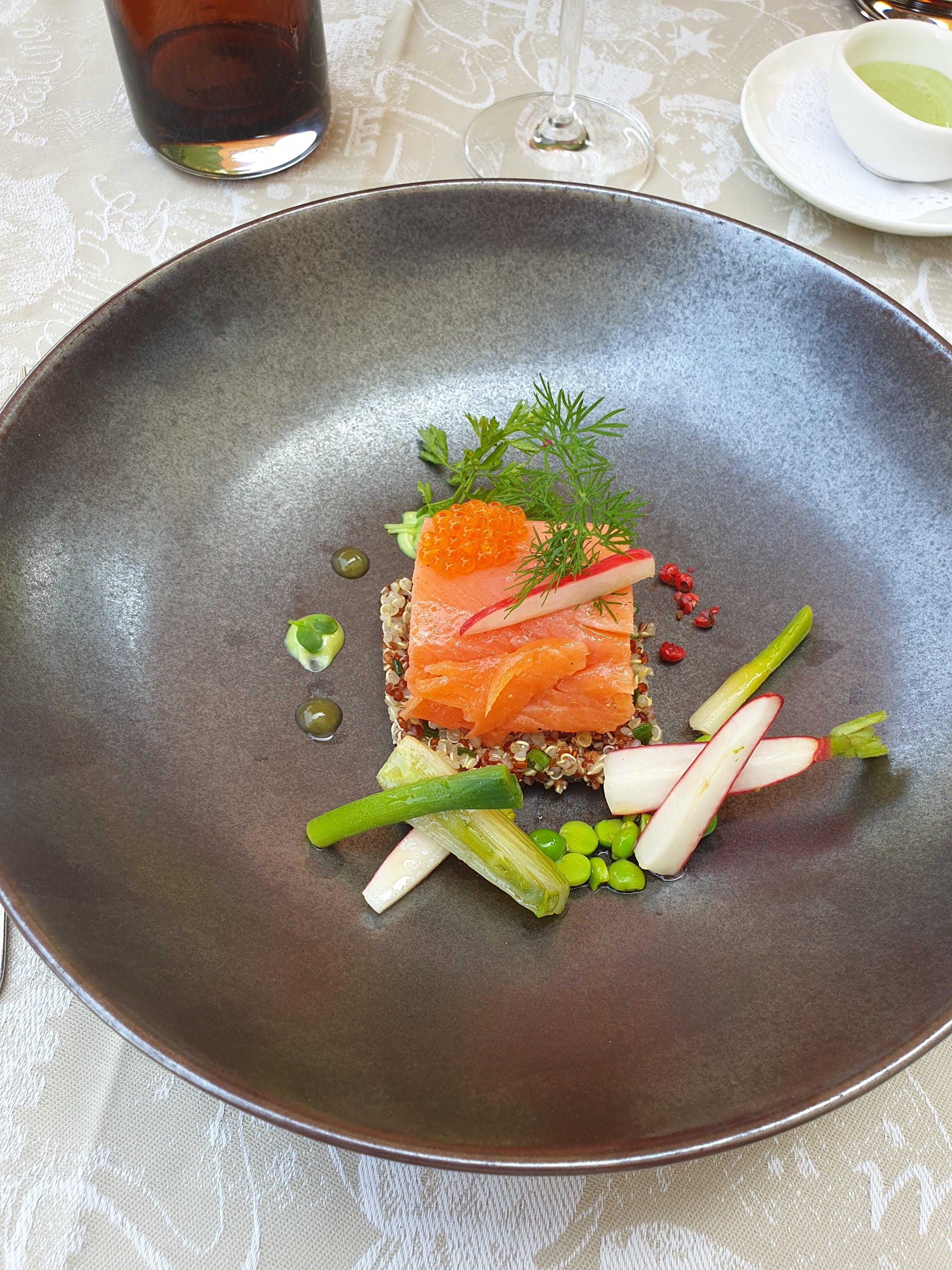Un repas gastronomique d'exception , pressé de homard et saumon, gouttes de pommes de terre, cromesquis d'escargots émulsion d'herbes du jardin , carré de veau rôti à la chapelure de champignons, petits pois et truffes d'été , fromage, chocolat tainori sur son fin sablé, framboises et agastache. Bon appétit !