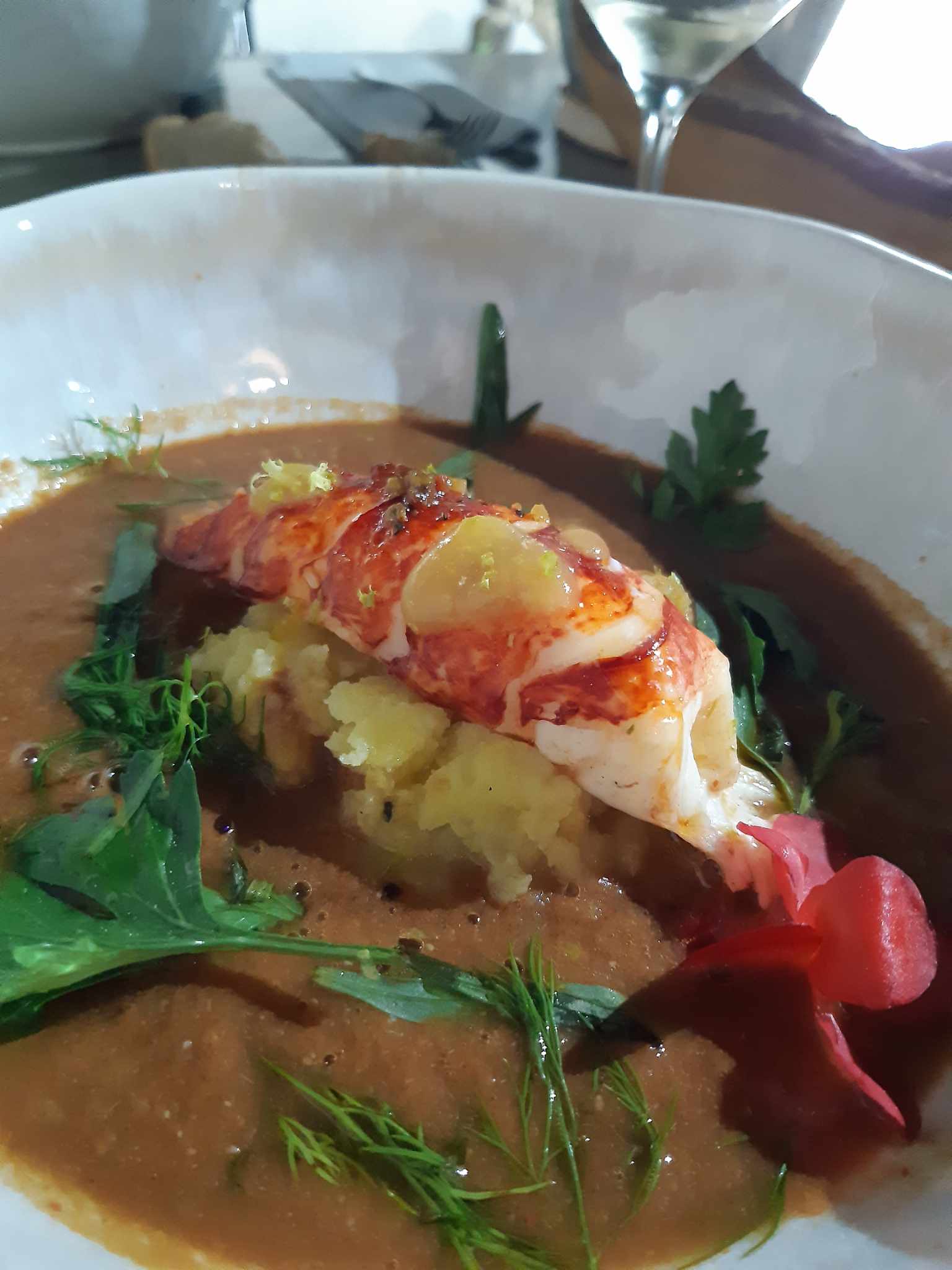 Sublime du début jusqu'à la fin Le foie gras est une pure merveille. Quant au homard bleu breton les mots me manquent tant c était un delice ! Et le dessert poire pochée safran bio et chocolat mousseux avec fine tuile chocolat dessus termine ce repas accompagné de vin au verre suggéré fort justement avec chaque mets. Même le pain est fait maison. Ce jeune chef mérite nos encouragements et son bel établissement dans un ancien relais de coches admirablement restauré vaut bien une visite pour y prendre goût comme nous l avons fait nous mêmes avec un plaisir toujours renouvelé. Merci à Thierry et à son papa.