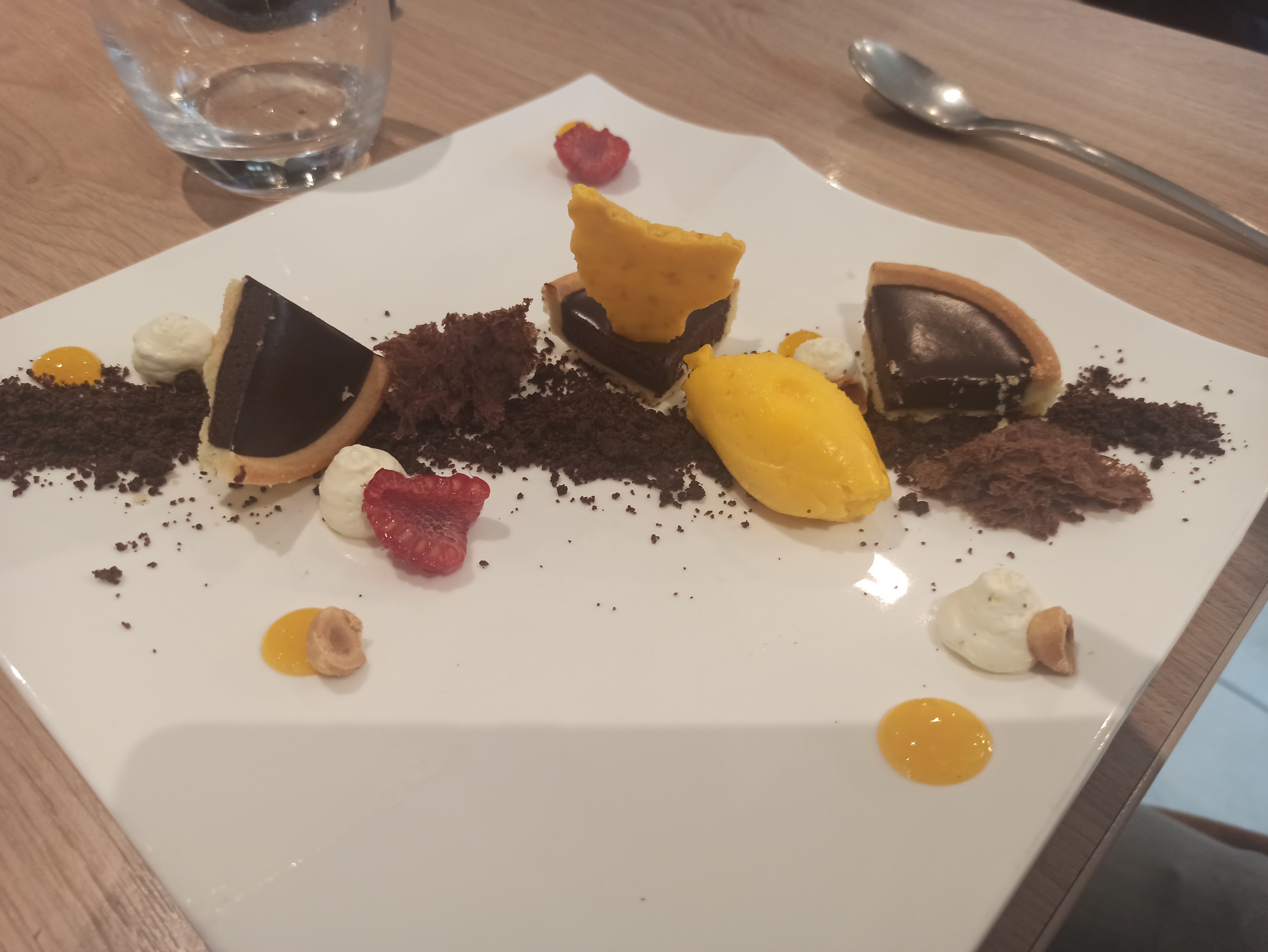 Merci pour ce trės bon moment en famille. Repas délicieux, mention spéciale pour le dessert avec le finger au chocolat (photo) et la spectaculaire sphère flambée ! Les entrées n'étaient pas en reste avec une truite gravlax delicieuse. Bravo à l'équipe pour son efficacité et toute l'attention portée à notre tablée. J'espère à très bientôt !