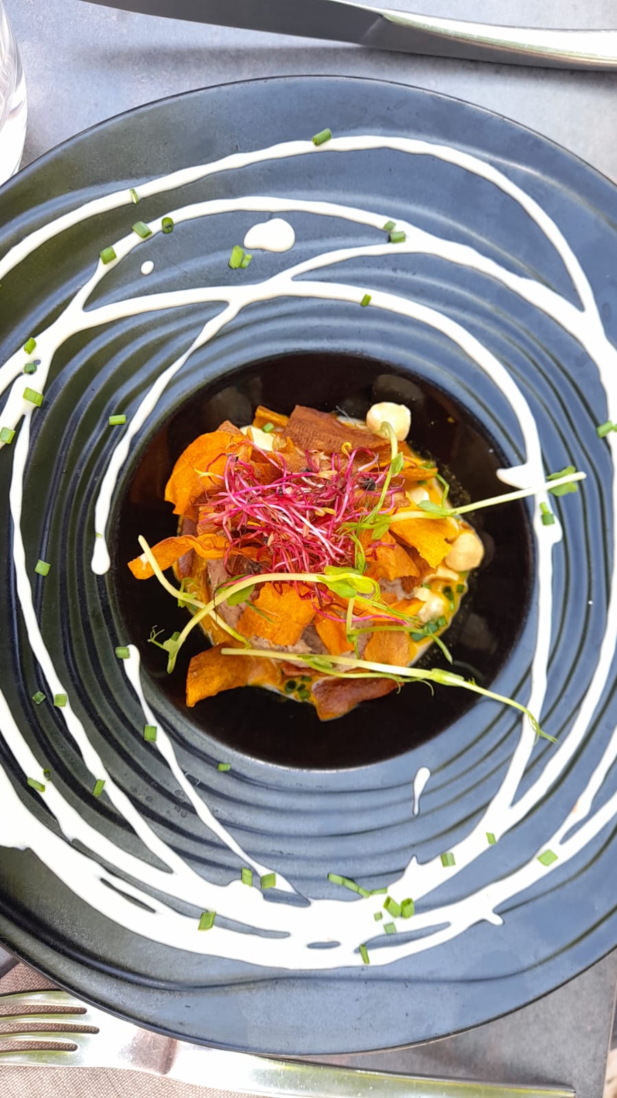 Belle découverte. Un lieu magnifique. Un service souriant et bien rythmé. Des mets bien élaborés, des cuissons bien maîtrisées. Nous nous sommes régalées. En revanche il est dommage de retrouvé le même bout de radis noir de carotte et jeune pousse de l’entrée dans tous les plats de l’entrée aux plats chauds.