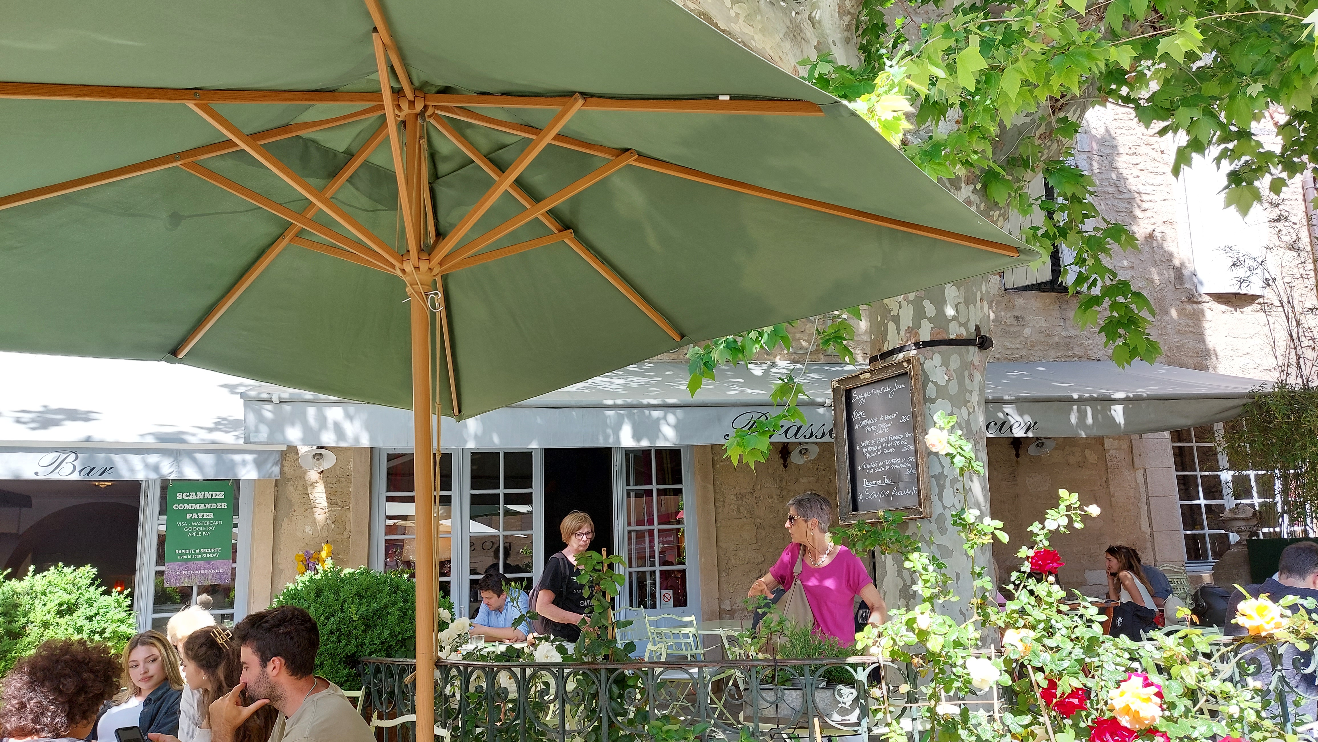 Superbe lieu ombragé, manger dans ce restaurant c'est plonger dans un livre de Giono! Les plats sont élaborés avec des ingrédients de qualité et le service remarquable. Mention speciale pour Mattei qui nous a trouvé une place rapidement et avec le qourire, tres delicat.