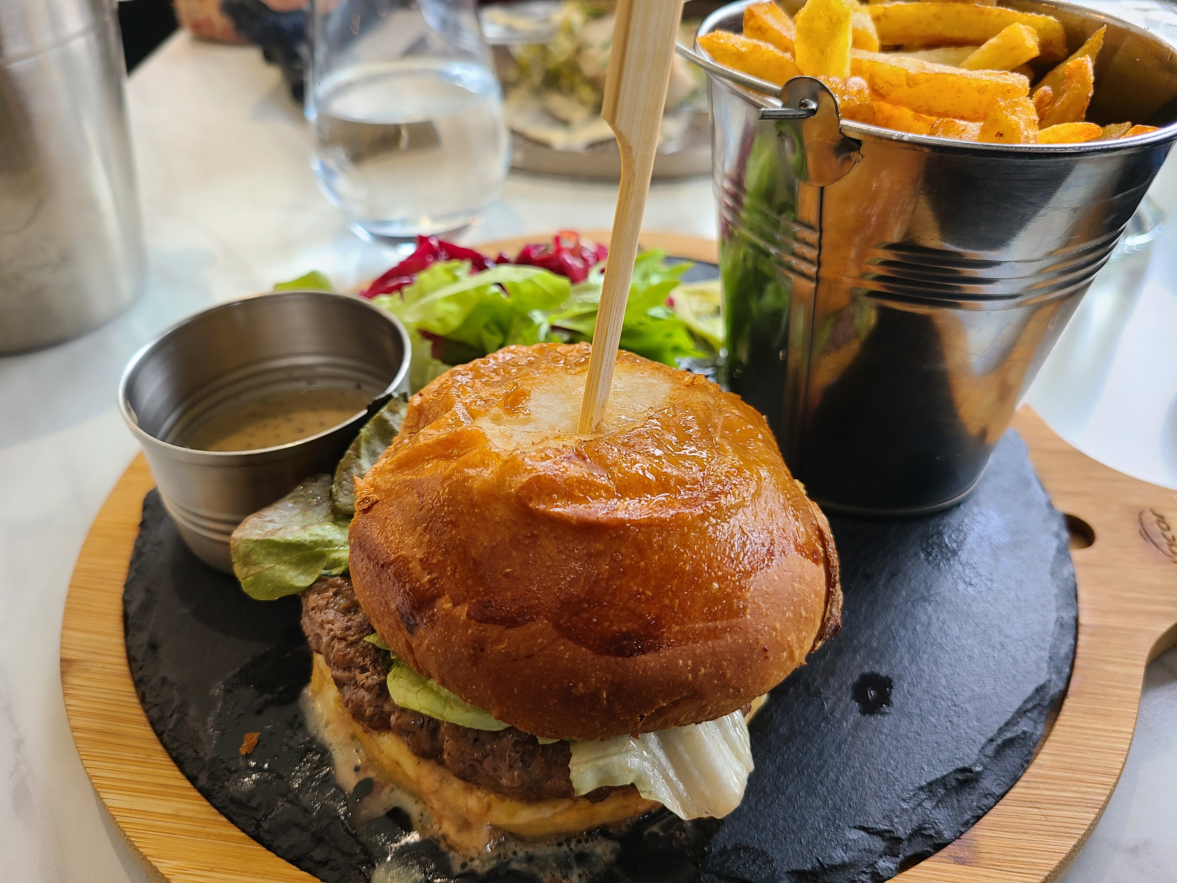 On a mangé. Pour ce qui est du service, rien à redire malgré qu'ils étaient débordés. Par contre, pour la cuisine... Deux burgers demandés saignants qui arrivent archi cuit, à la limite du brûlé, bon ça arrive. On demande un changement qui se fait assez rapidement, mais la serveuse nous signifie que le chef savait qu'il les avait oublié. Mais du coup, pourquoi servir ? Dessert maison inscrit sur la carte, mais j'imagine que les gourmandises accompagnant le café ne sont pas des desserts....