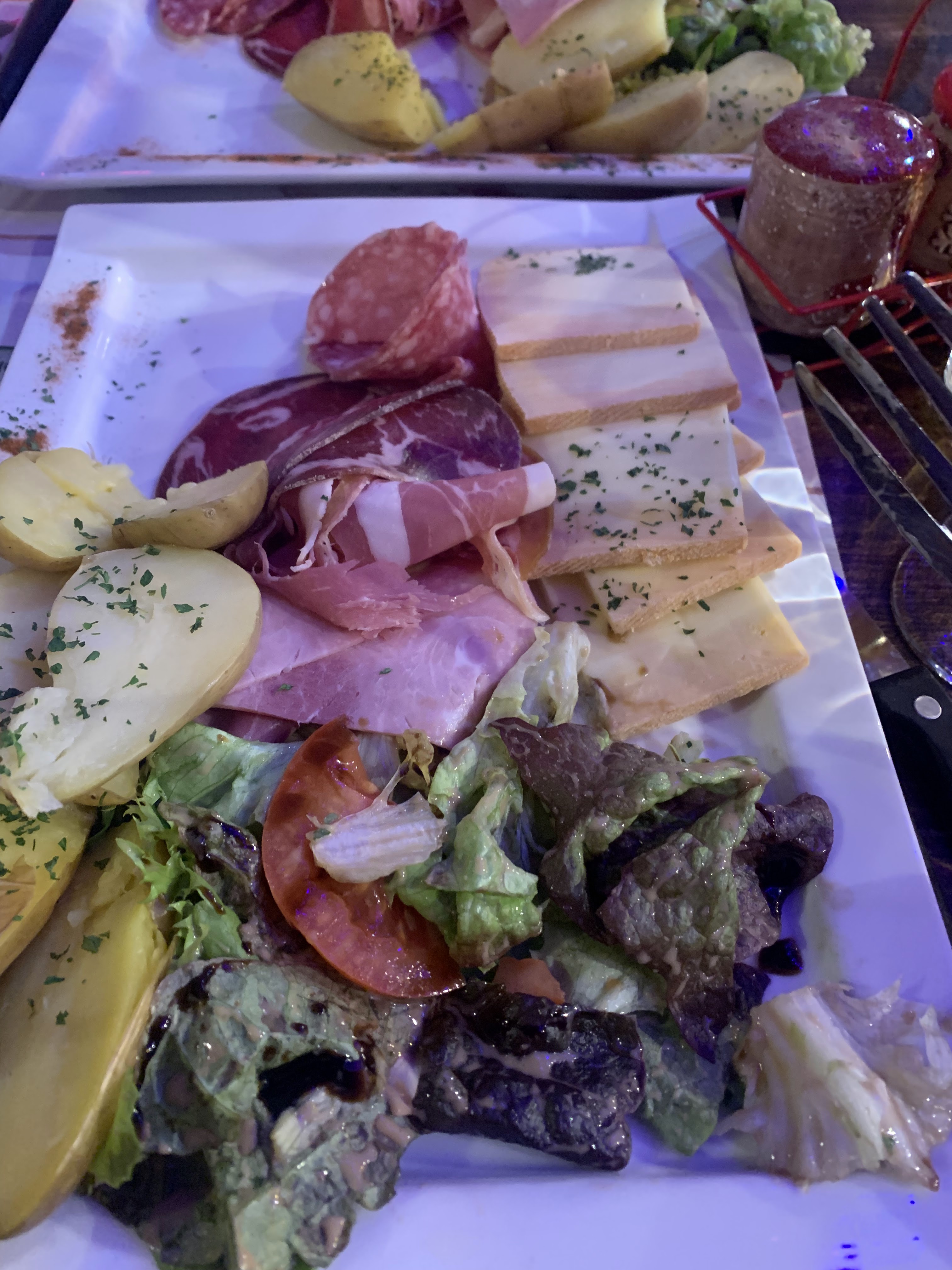 Bien mangé, bon fromage local fondu et charcuterie, bonne crème brûlée sucrée, cher