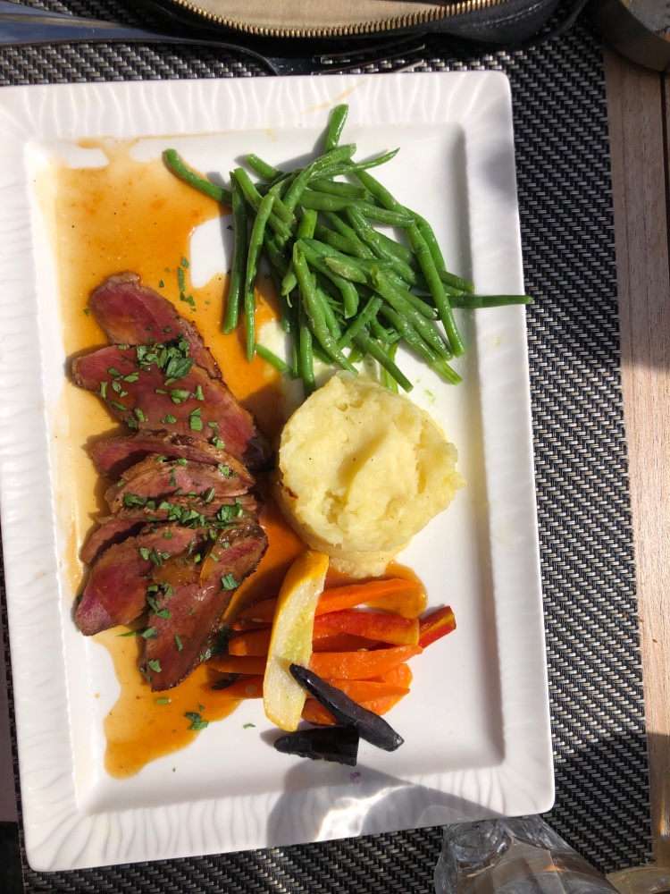 Magnifique soleil d'hiver sur la terrasse. La nourriture était bonne... principalement. J'ai été déçu à deux reprises par la commande de Filet be Boeuf mais par la réception d'une queue de filet en forme de papillon, trop cuite et pas tendre. Peut-être que je commande mal. Nos autres cours étaient plutôt corrects. Le service était agréable. Les prix étaient bons.